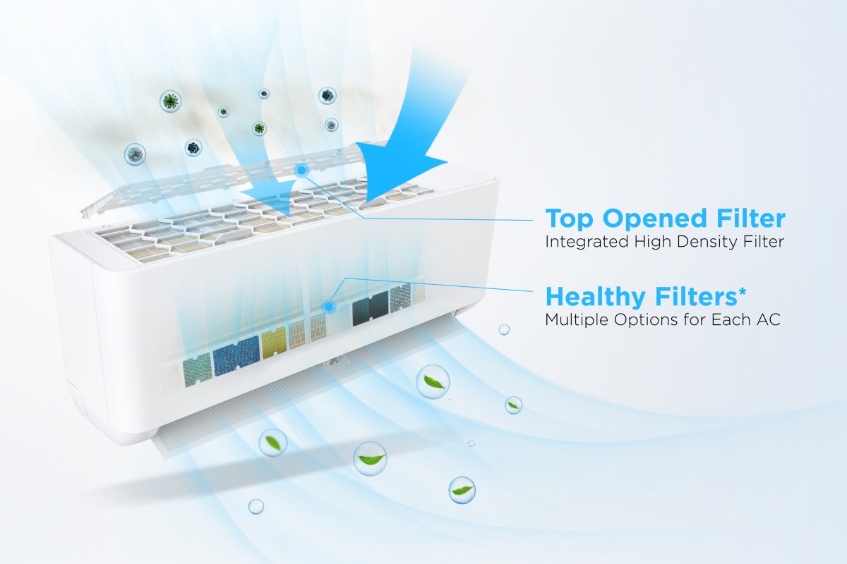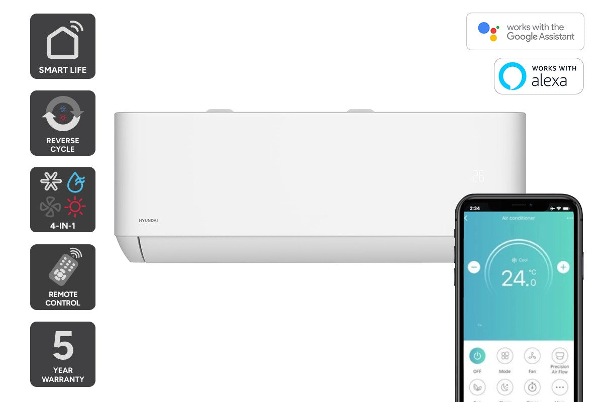 A powerful inverter split air conditioner capable of both cooling and heating (reverse cycle). Equipped with smart features (Wi-Fi, app, voice assistant compatibility) and multiple operational modes (cool, heat, dehumidify, fan). Suitable for larger rooms or spaces needing robust climate control.