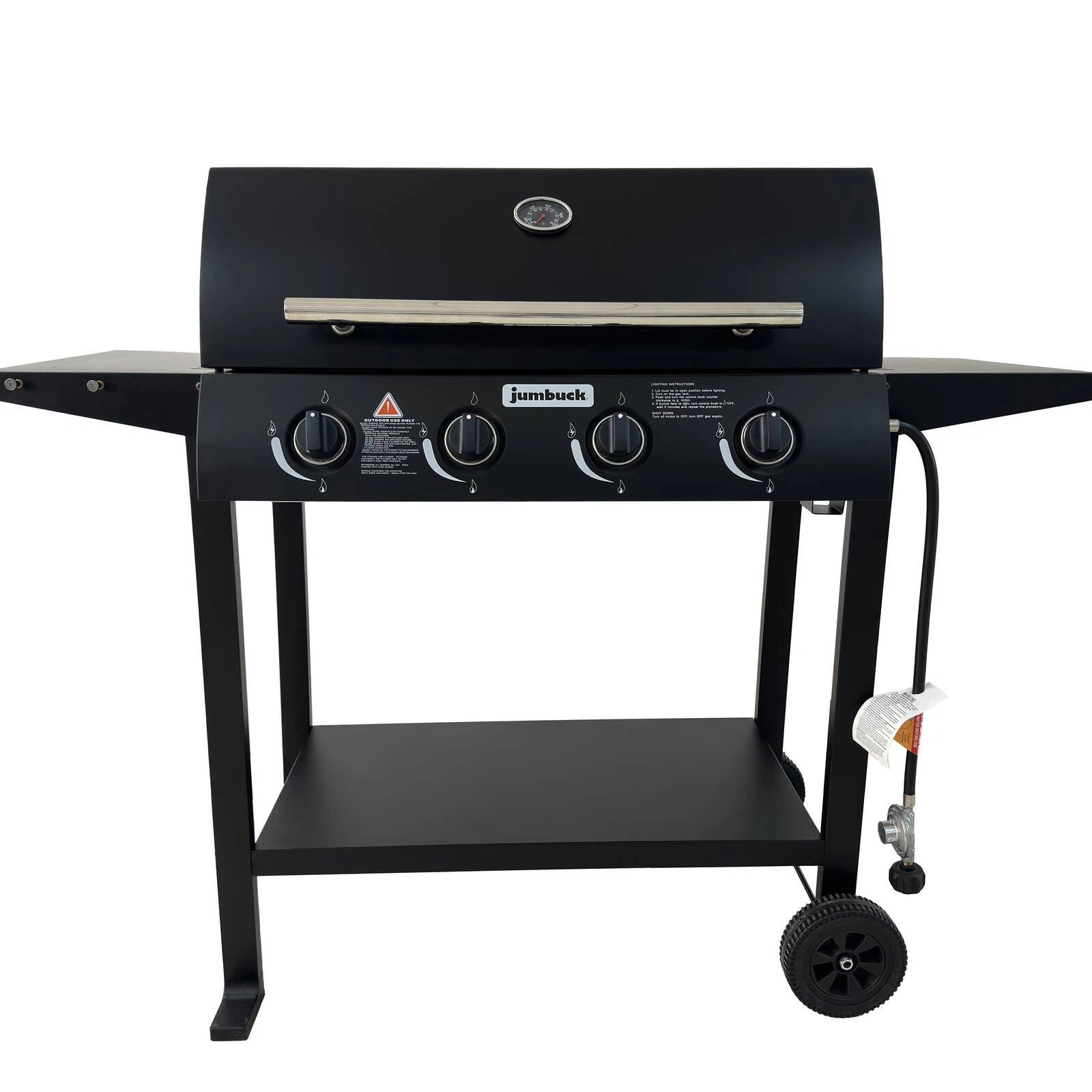 Includes 1 x Jumbuck 4 Burner Portland Hooded Gas BBQ, gas hose, and regulator.