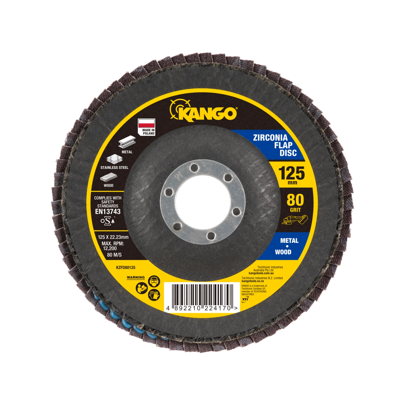 Achieve professional results with the Kango 125mm 80G Zirconia Flap Disc, designed for efficient material removal and surface finishing. Perfect for working on edges, weld seams, and small surfaces, this flap disc offers durability and precision for metal and wood applications.