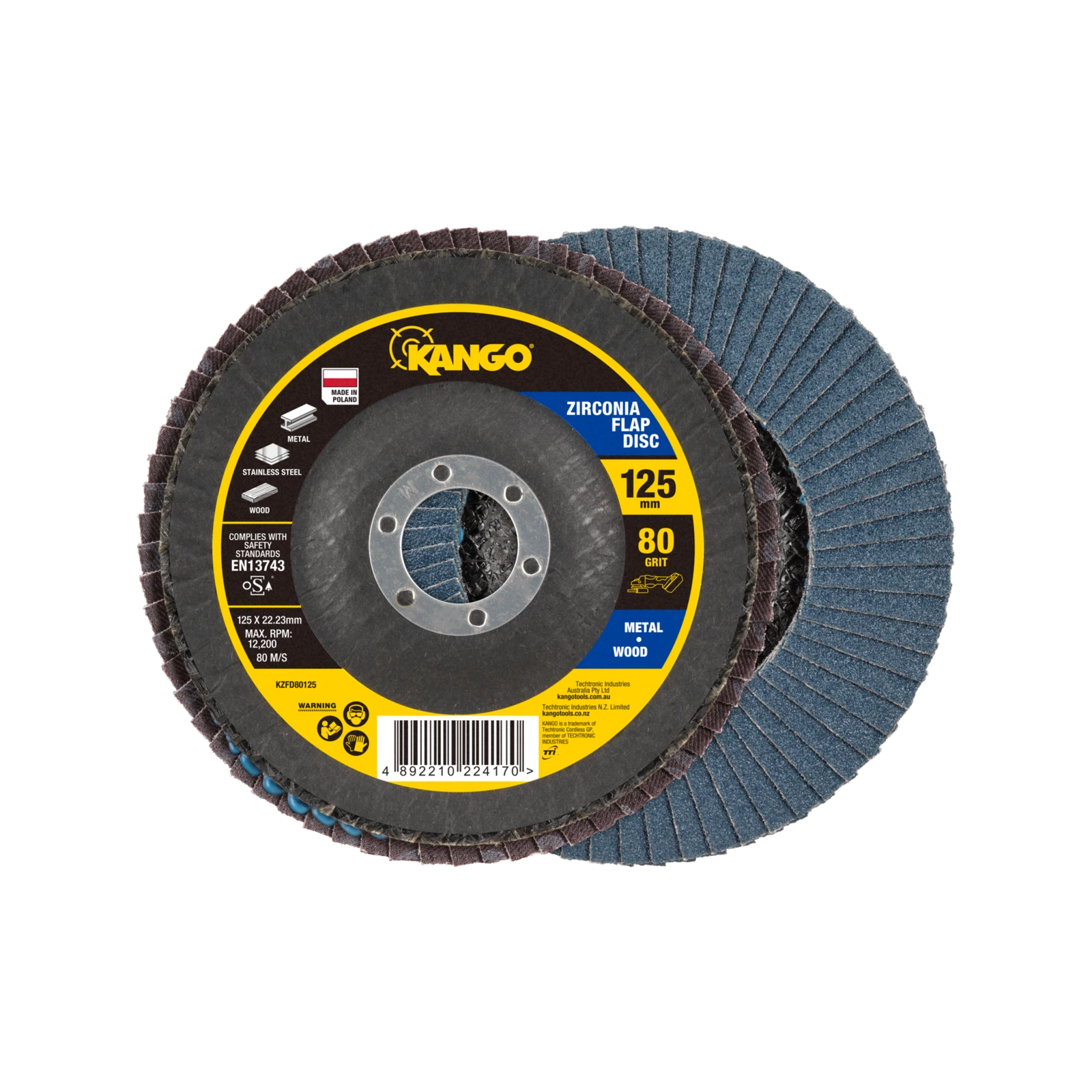 Enhance your grinding and finishing tasks with the reliable performance of the Kango 125mm Zirconia Flap Disc. Perfect for professional and DIY projects alike.