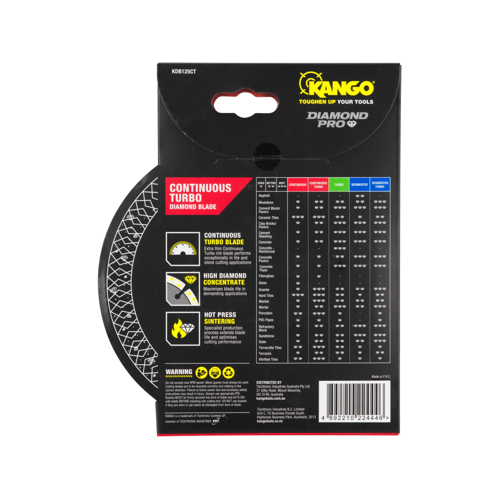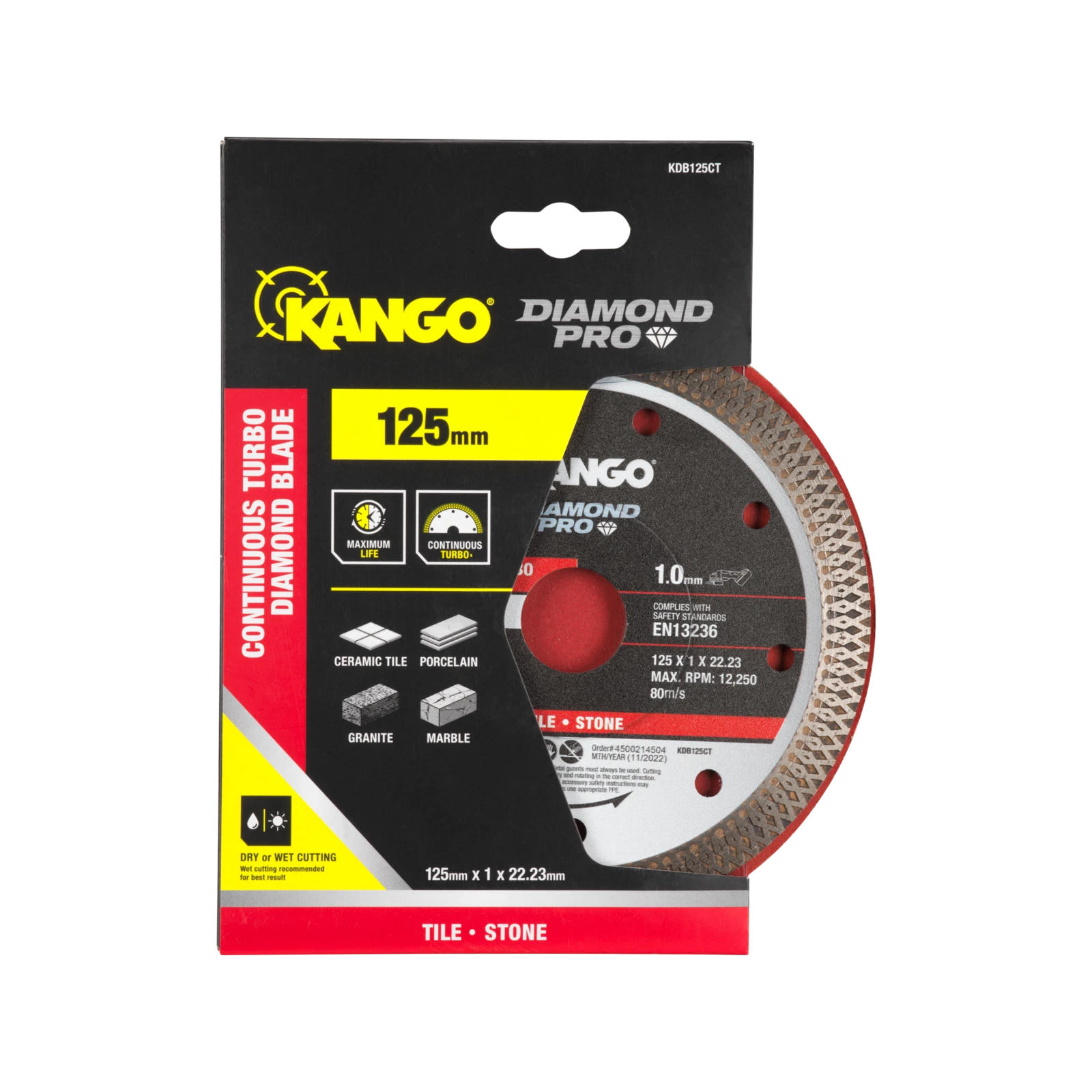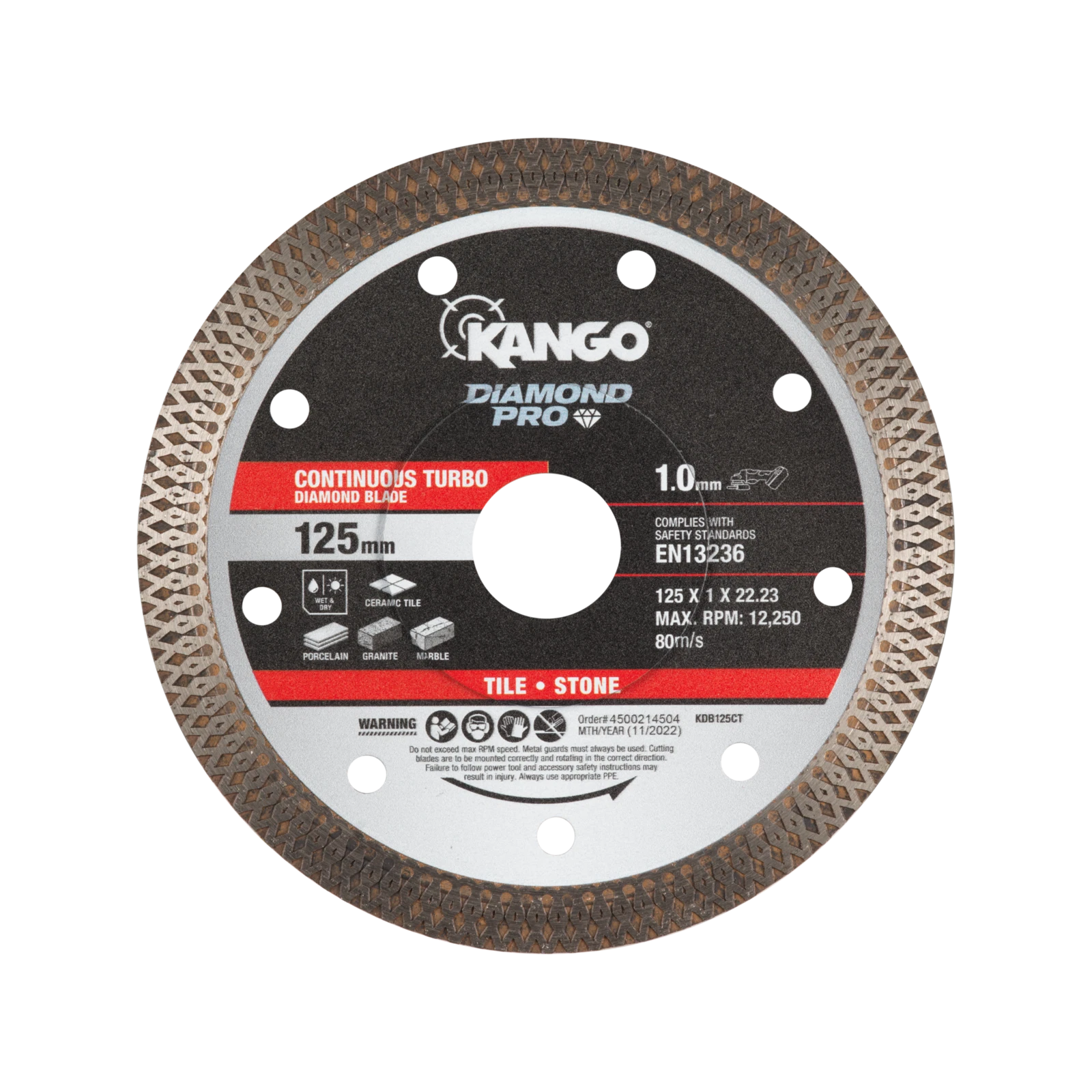 Achieve precise, smooth cuts with the Kango 125mm Continuous Turbo Diamond Blade. Designed for cutting ceramic tiles, granite, marble, and porcelain, this high-performance blade offers durability and efficiency for both professional and DIY projects.