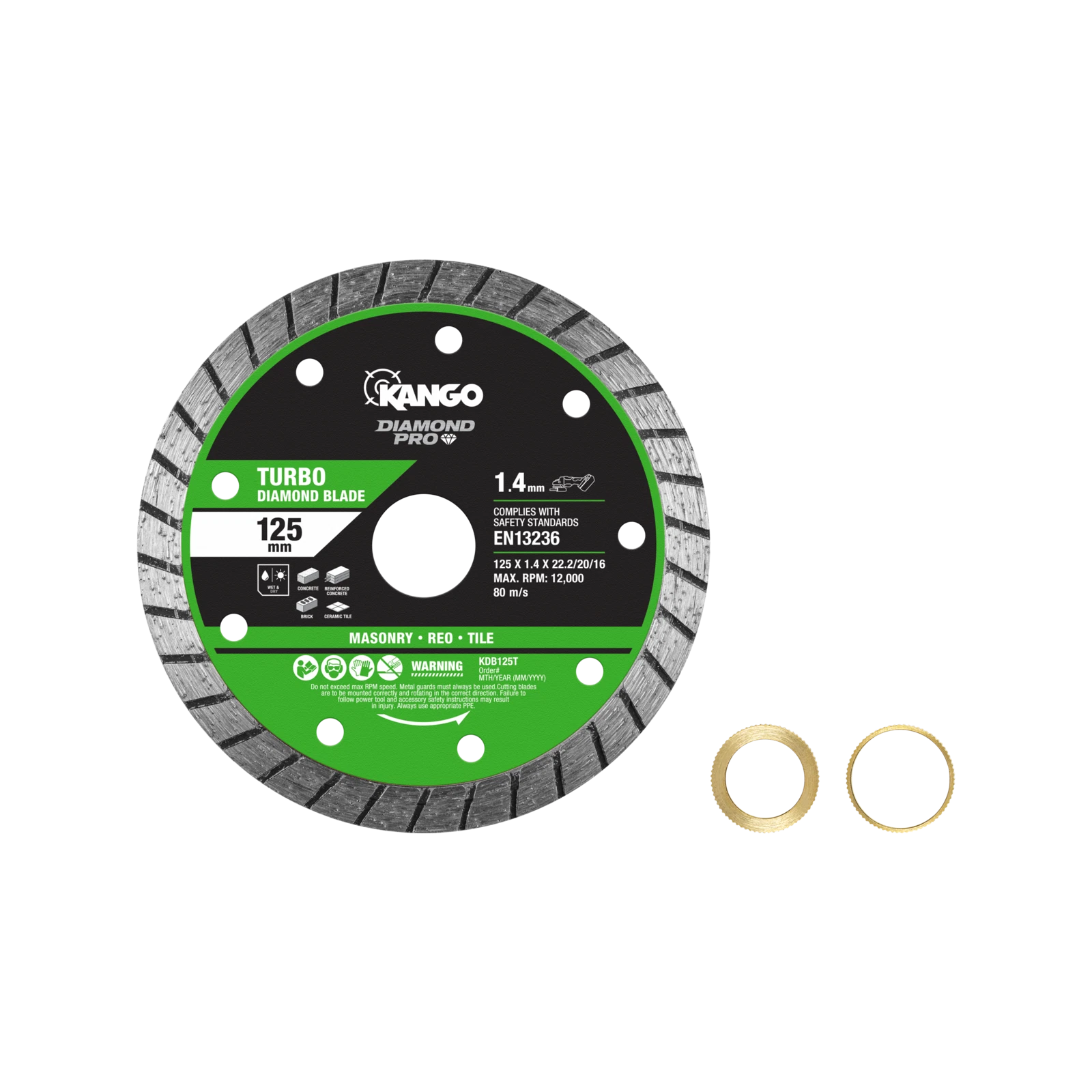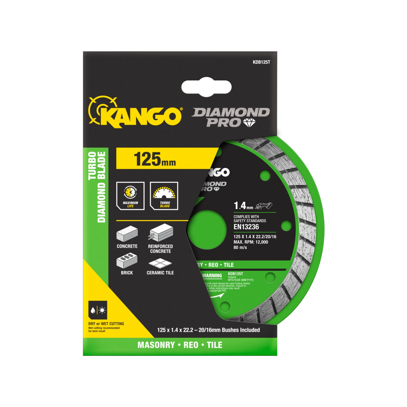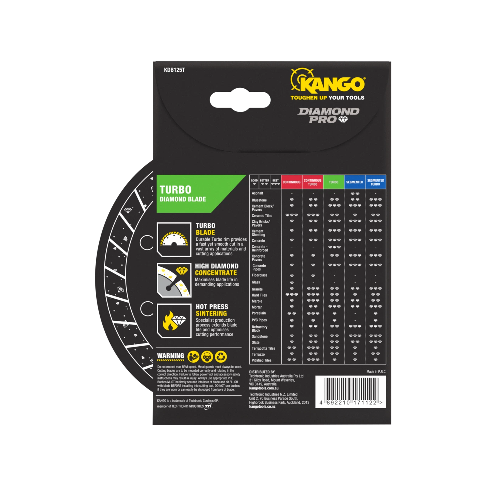 Upgrade your cutting toolkit with the Kango 125mm Turbo Diamond Saw Blade, designed for fast, precise, and smooth cuts through a variety of materials. Engineered for durability and performance, this blade is ideal for professional tradesmen and DIY enthusiasts alike.