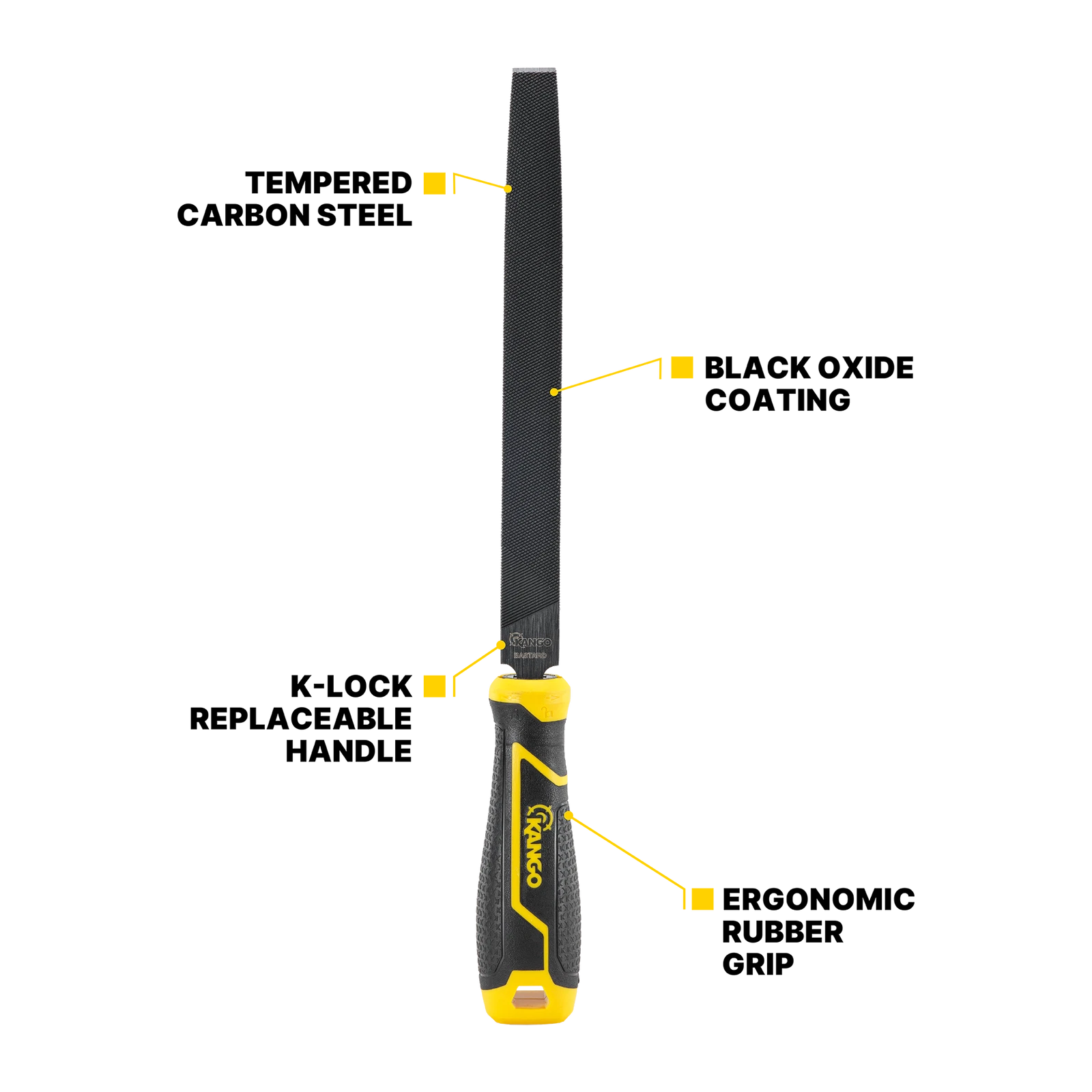 The Kango 200mm Flat Bastard Cut File is engineered from high-quality tempered carbon steel to maintain sharpness during use. Its black oxide coating enhances durability by protecting against rust and friction. The ergonomic rubber grip on the K-lock handle ensures comfortable handling, while the handle itself detaches easily with a simple twisting motion. A hang hole allows for convenient storage.