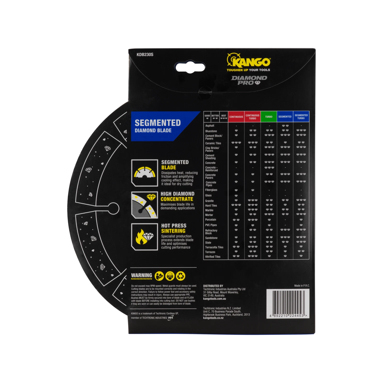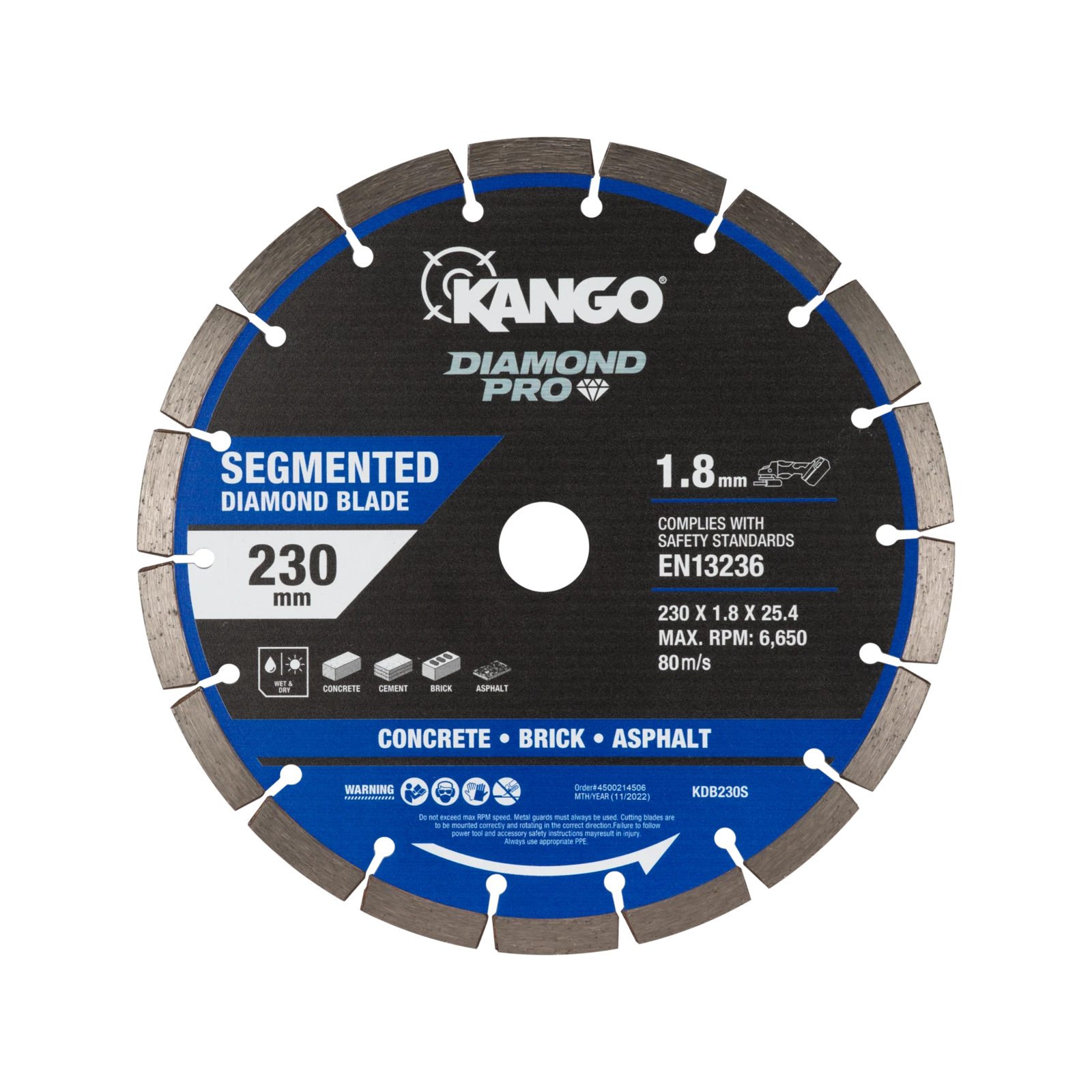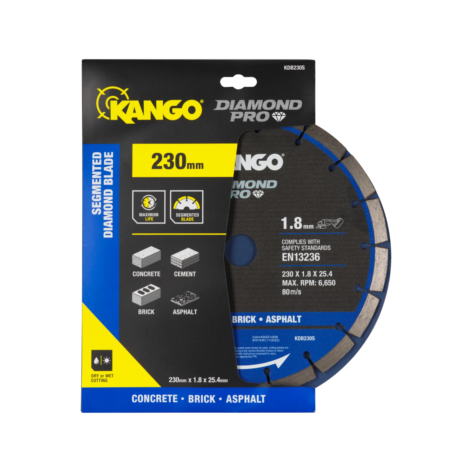 Upgrade your cutting toolkit with the Kango 230mm Segmented Diamond Blade, designed for efficient and precise cutting of concrete, brick, asphalt, and cement. Whether you're working with wet or dry conditions, this durable blade delivers reliable performance every time.