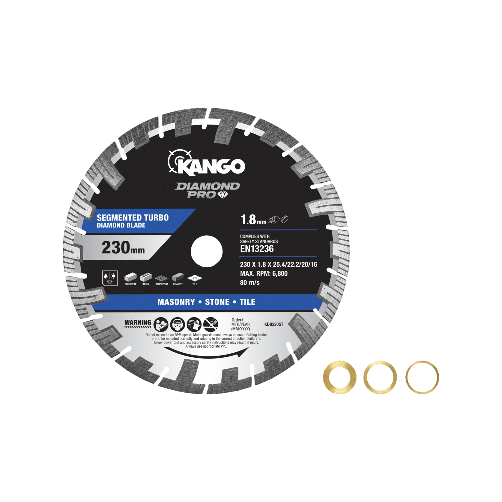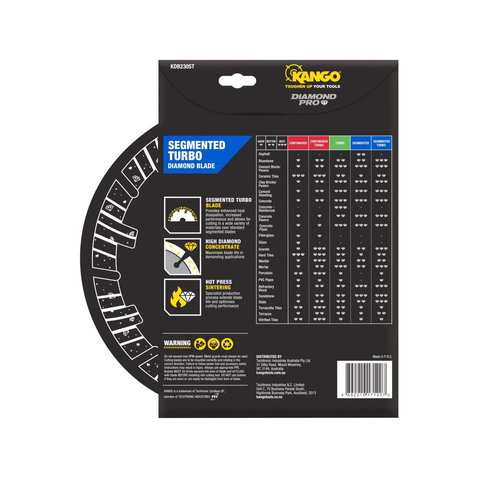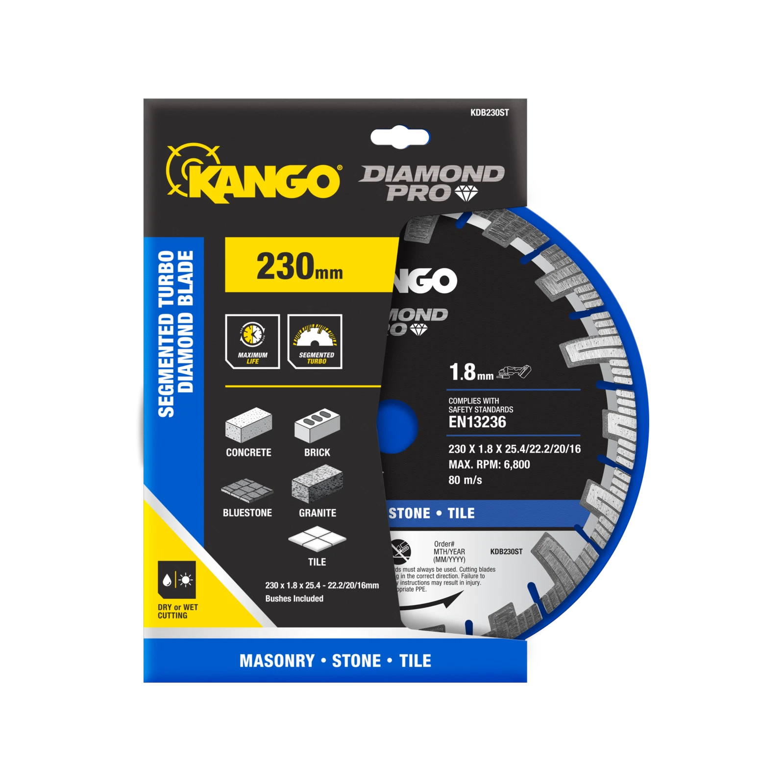 Upgrade your cutting toolkit with the Kango 230mm Segmented Turbo Diamond Saw Blade. Designed for precision and durability, this blade delivers fast, clean cuts on a variety of materials. Whether you're working on concrete, brick, or stone, this blade is engineered to perform efficiently and reliably.