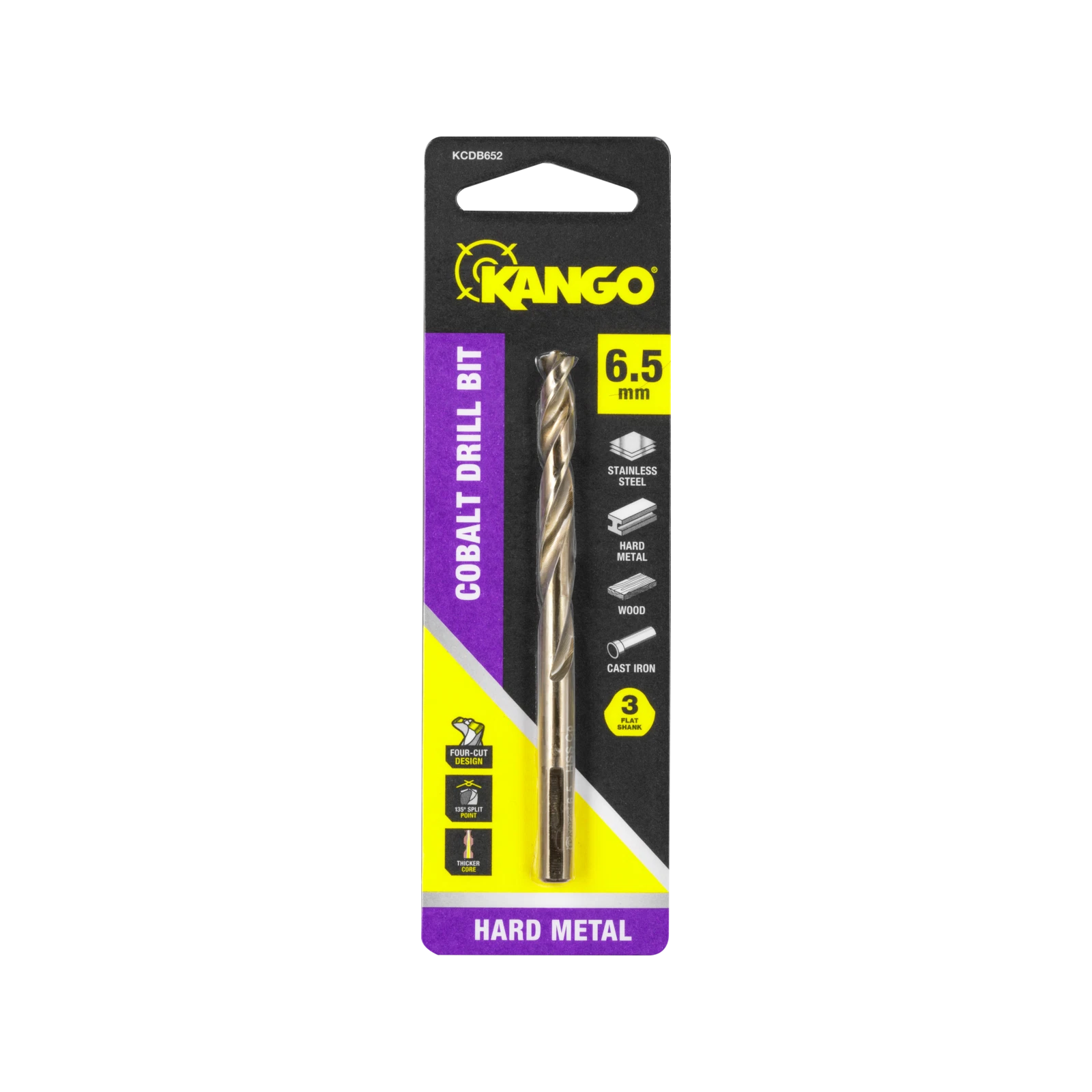 The Kango 6.5mm Cobalt Drill Bit features a tapered core for added strength and durability, helping to prevent breakage during tough jobs. Its rapid eject flute shape efficiently removes chips and material, supporting faster drilling speeds. The tip's 135° split point offers greater precision and stability, making it ideal for detailed work and hard materials.