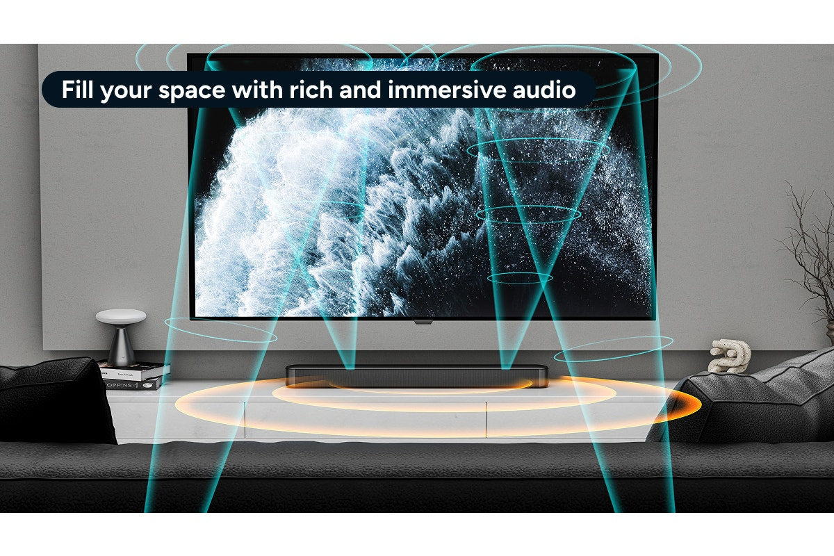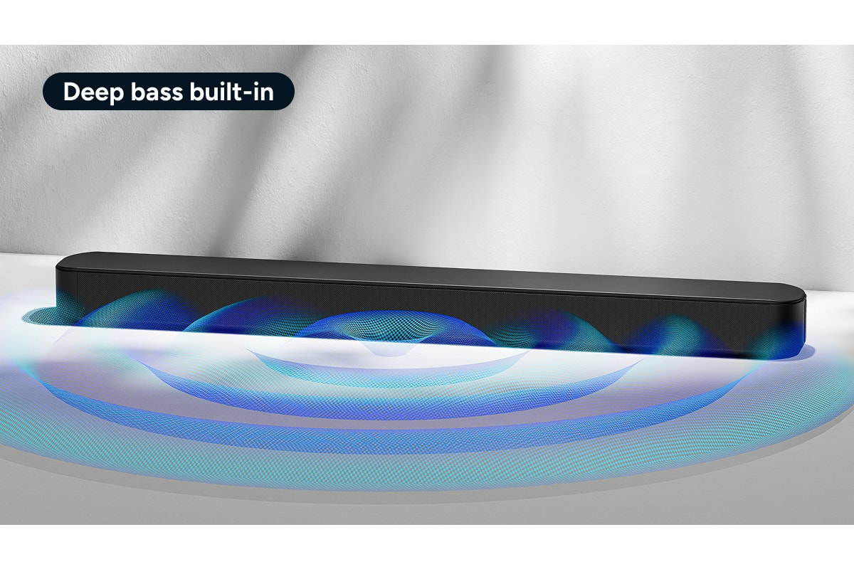 With its slim, understated design, this soundbar fits seamlessly beneath your TV or can be wall-mounted for a clean, modern aesthetic. It’s designed to complement your space while delivering powerful sound performance.