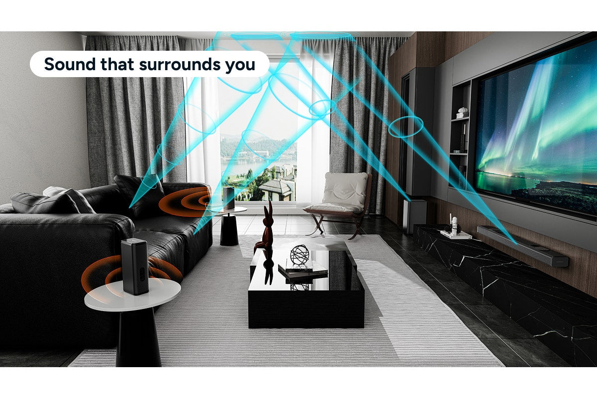 With its slim soundbar, compact subwoofer and rear satellite speakers, the system fits perfectly into any modern home. Its wireless design allows flexible placement without clutter, keeping your setup clean and stylish.