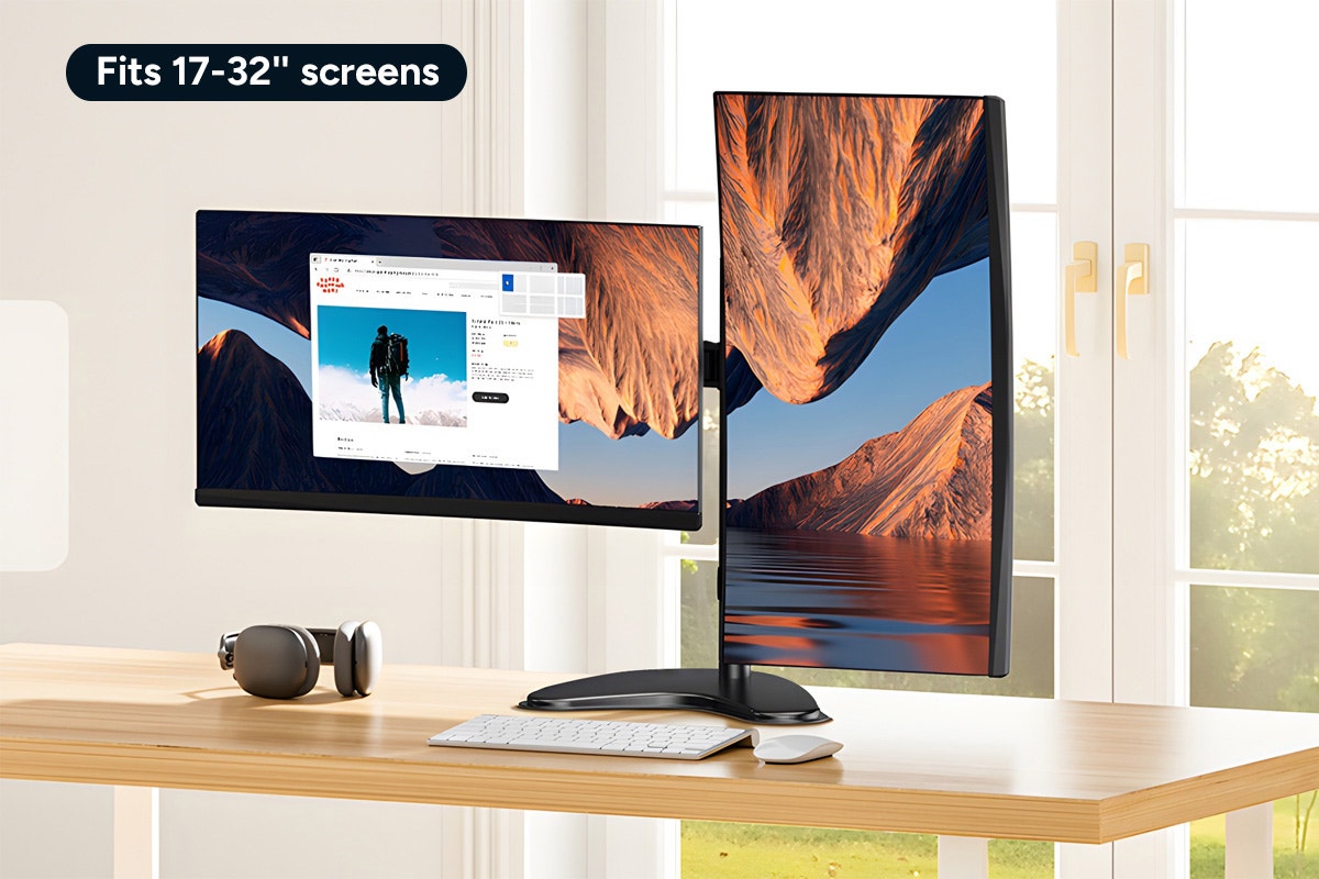 The free +45° ~ -45° tilting design and 360° rotation provide unparalleled flexibility, allowing you to adjust your screens to reduce glare and achieve the perfect angle for every task. Transition effortlessly between portrait and landscape modes to suit your workflow.