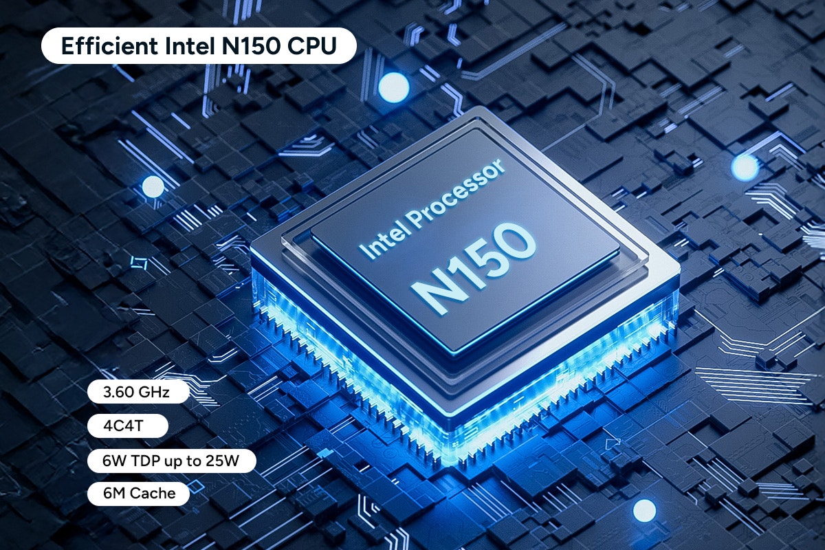 The Intel N150 processor is a quad-core CPU designed to handle daily computing tasks with ease. Whether you’re browsing, using office software, or streaming content, the processor delivers a balance of performance and energy efficiency, so you can stay productive longer without missing a beat.