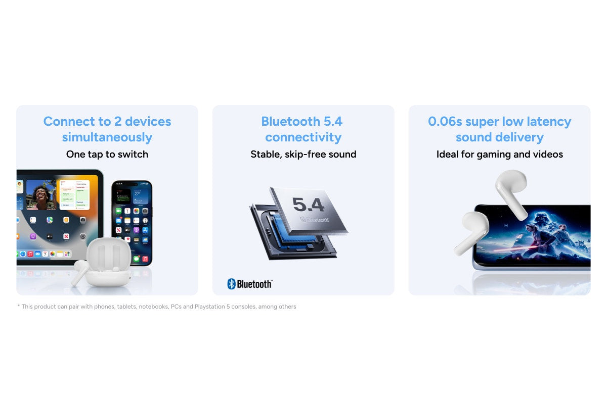 Bluetooth 5.4 provides stable, fast wireless pairing with up to 10m range. Connect to two devices at once so you can switch from music on your laptop to answering calls on your phone with ease.