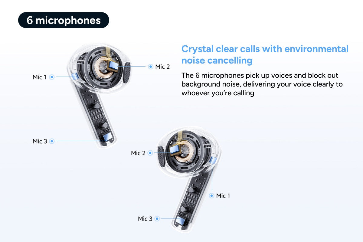 With 6 microphones and ENC technology, your voice is filtered and background noise is minimised. Whether you’re in a café, on public transport or walking outside, calls stay sharp and uninterrupted.