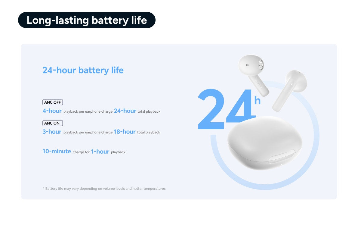 Enjoy up to 4 hours of playback per charge, with the charging case providing up to 24 hours of battery. Combined with USB-C fast charging, you’ll always have your music when you need it.