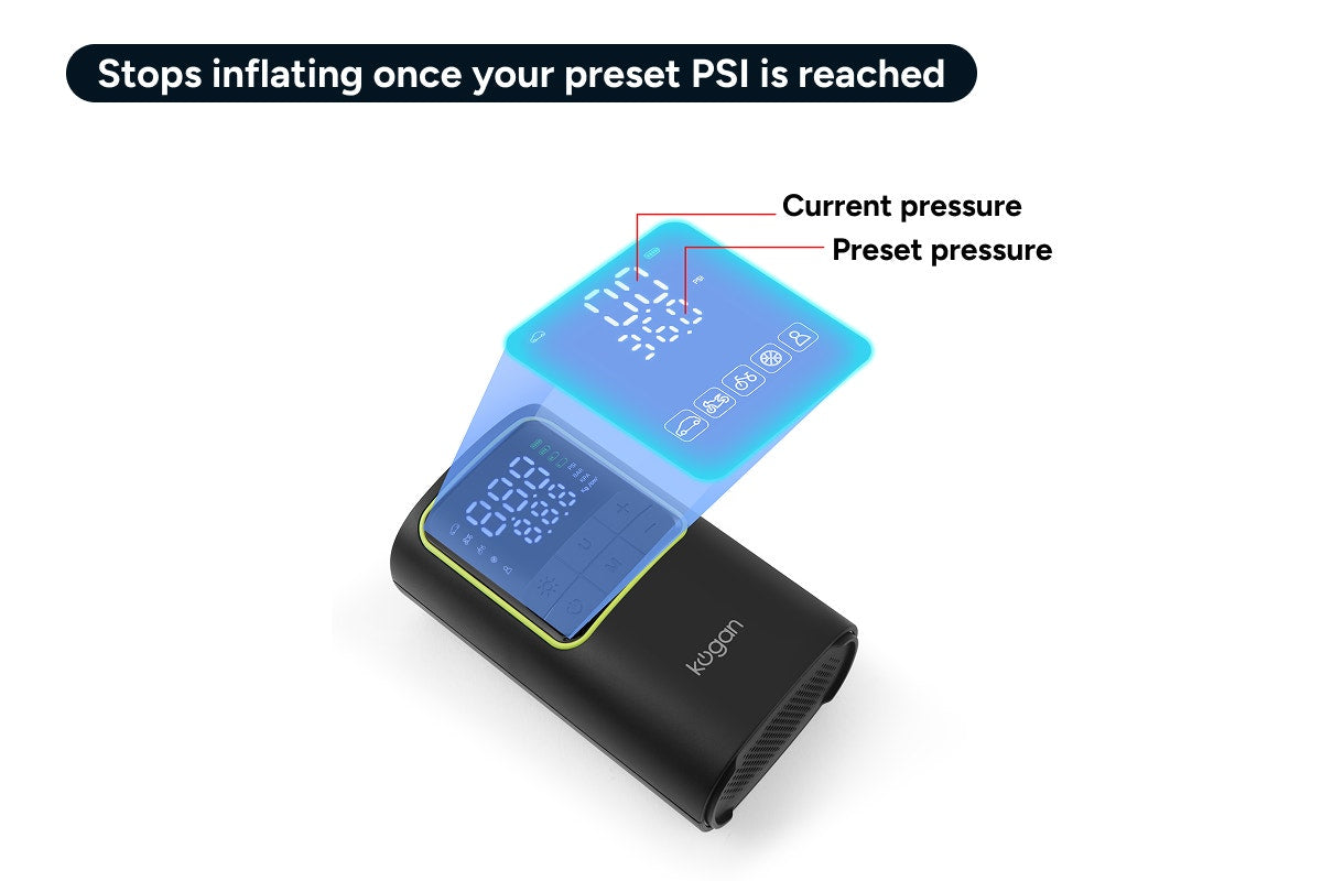 Monitor both current and preset PSI in real time with a crisp, dual-row digital display. Just set your desired pressure and let the smart shut-off do the rest – no guesswork, no overinflation.