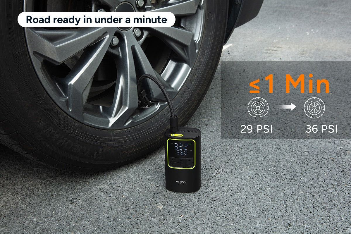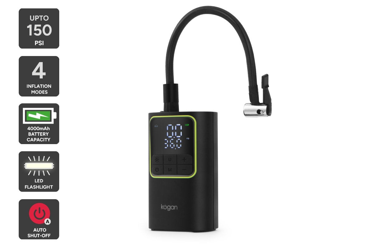 Power through flat tyres fast with the Kogan™ Portable Air Compressor. Compact, cordless and ultra-efficient, it delivers rapid inflation, real-time pressure monitoring and emergency lighting all in one sleek unit.