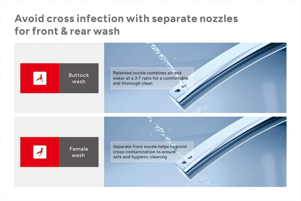 Enjoy front and back hygienic cleaning with dual adjustable nozzles that allow you to tailor the position, temperature, and pressure to your preference. The self-cleaning feature ensures optimal cleanliness after every use and prevents cross-contamination.