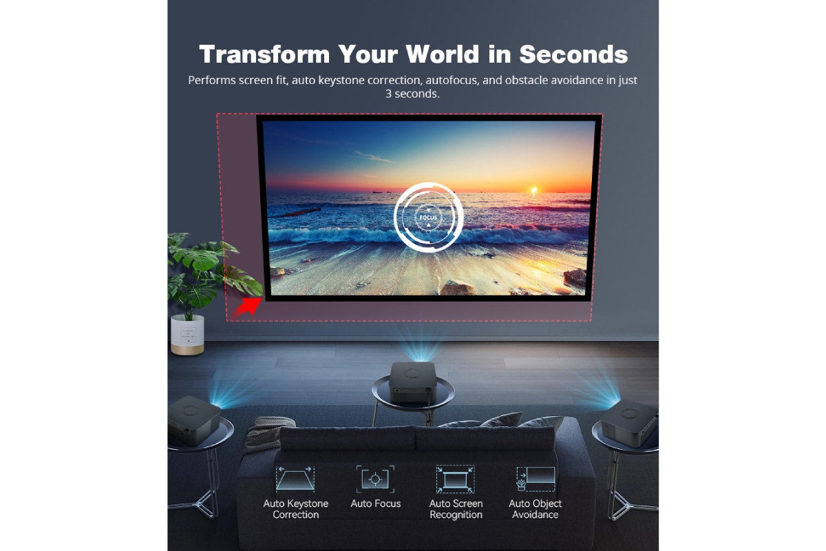 Say goodbye to complicated setups and constant adjustments. This projector features auto keystone correction, auto image alignment, and auto object avoidance for a hassle-free setup. These smart features automatically detect and correct the image to fit perfectly on any wall or surface, ensuring an optimal viewing experience.