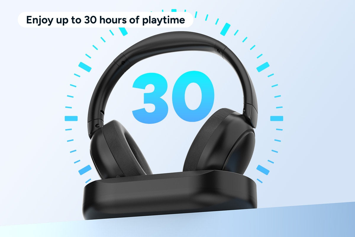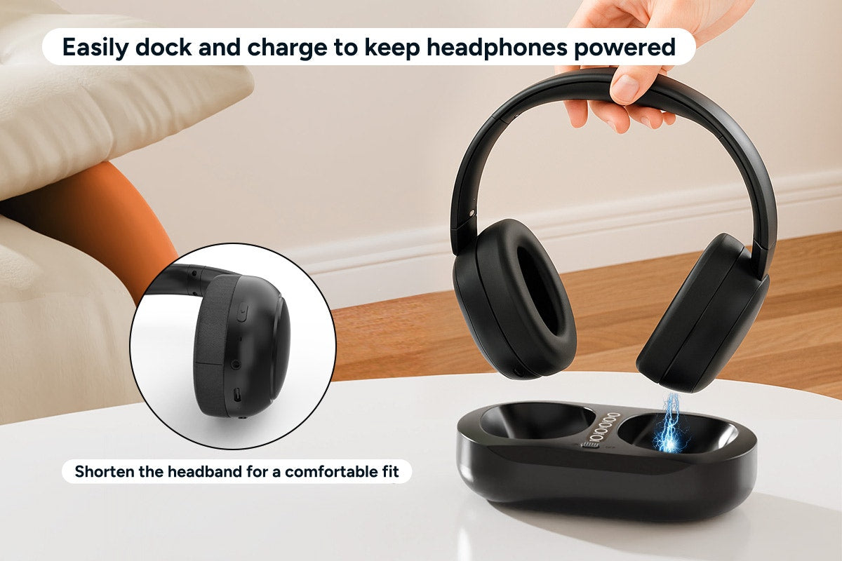 No need to fumble with cables. The included transmitter dock doubles as a stable signal base and a fast charger. Simply place the headphones on the dock when not in use and they’ll be ready to go in just 2.5 hours.