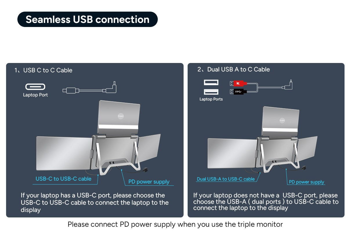 Instantly triple your laptop screen with the Kogan™ XPRESSO 15.6” Full HD Pro Triple Screen Monitor. Boost your productivity on the go with three vibrant 1080p displays powered by just a single cable – no drivers, no fuss.