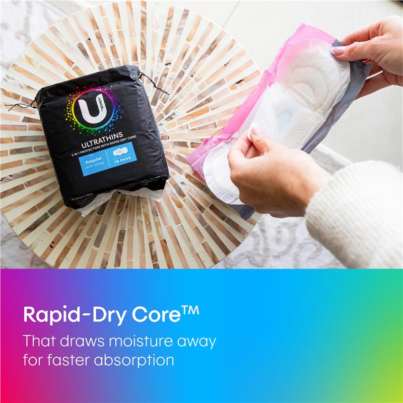 U by Kotex(R) Ultrathin Regular Pads with wings have with Rapid-Dry Core™ for freshness and an ultra-soft top layer for comfort. Their discreet, ultra-thin design feels like wearing nothing at all.