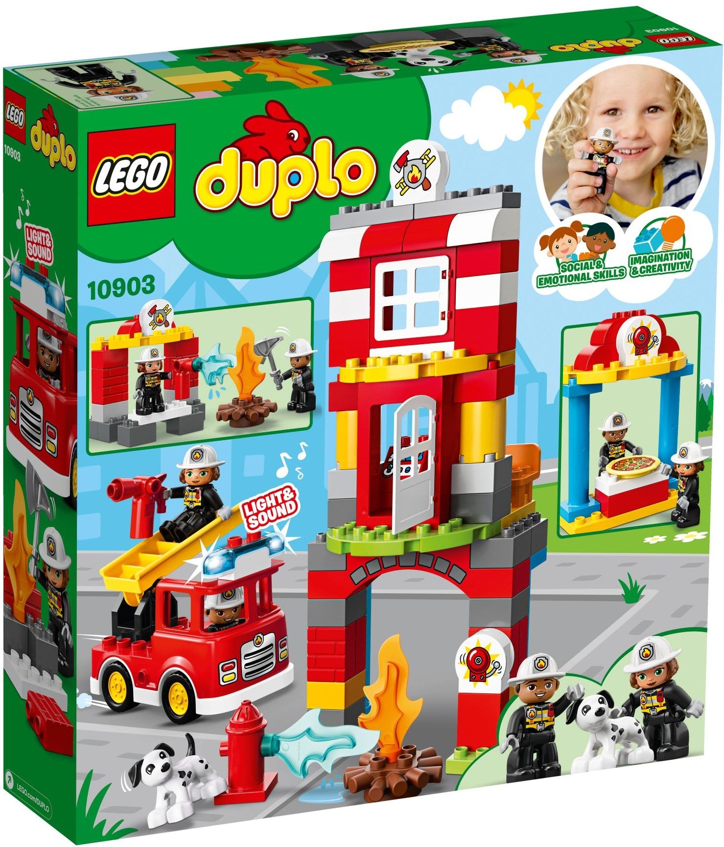 Play out real-life scenarios in LEGO® DUPLO® Town: a recognisable world with modern DUPLO figures. Visit the easy-to-build 10903 Fire Station and enjoy pretend play, helping the firefighters as they practice putting out the campfire and climbing the ladder to rescue the station dog in the tower. When the call comes in, help your toddler jump the firefighters into the fire truck, turn on the flashing light and siren, and head off on another daring rescue! Includes 2 DUPLO figures plus a dog figure.