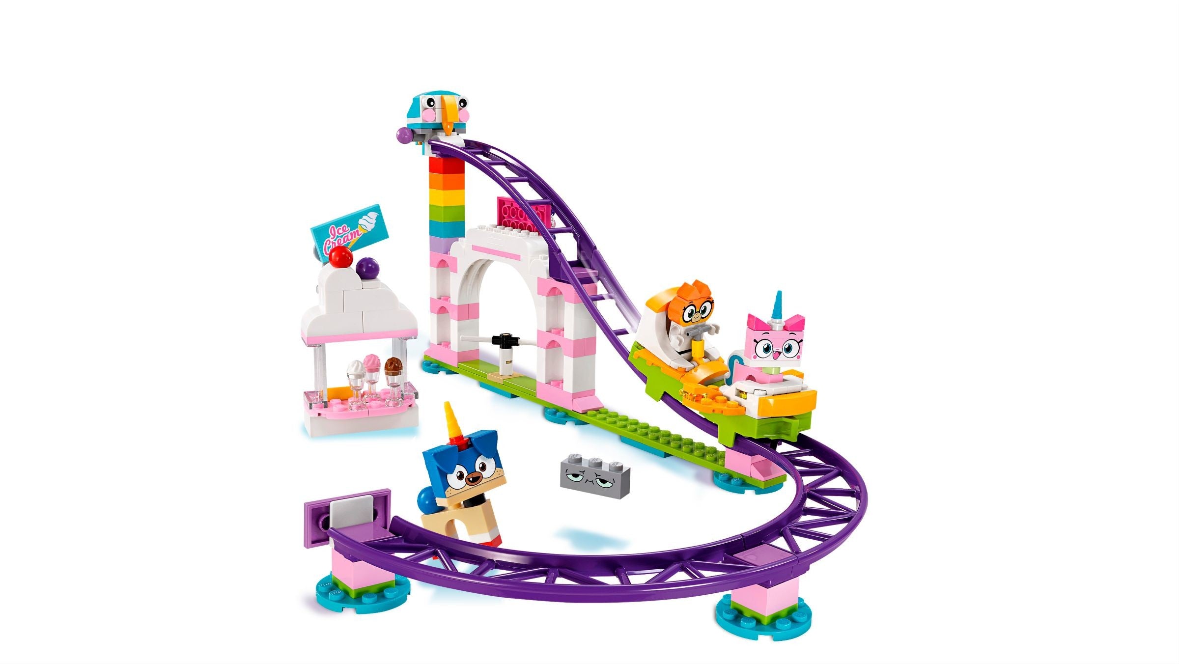 Relive favourite moments from the happiest, most sparkly, and most colourful TV series around with the LEGO® UnikittyTM! 41456 Unikingdom Fairground Fun Set. With a working roller coaster, spinning chair ride, and super cool dodgems, it’s impossible not to have fun! There's also a shop and 2 refreshment stands to buy treats while you wait in line for the rides. This set includes 5 buildable figures plus a Rick™ figure from the TV series to share a special and sparkly day with.