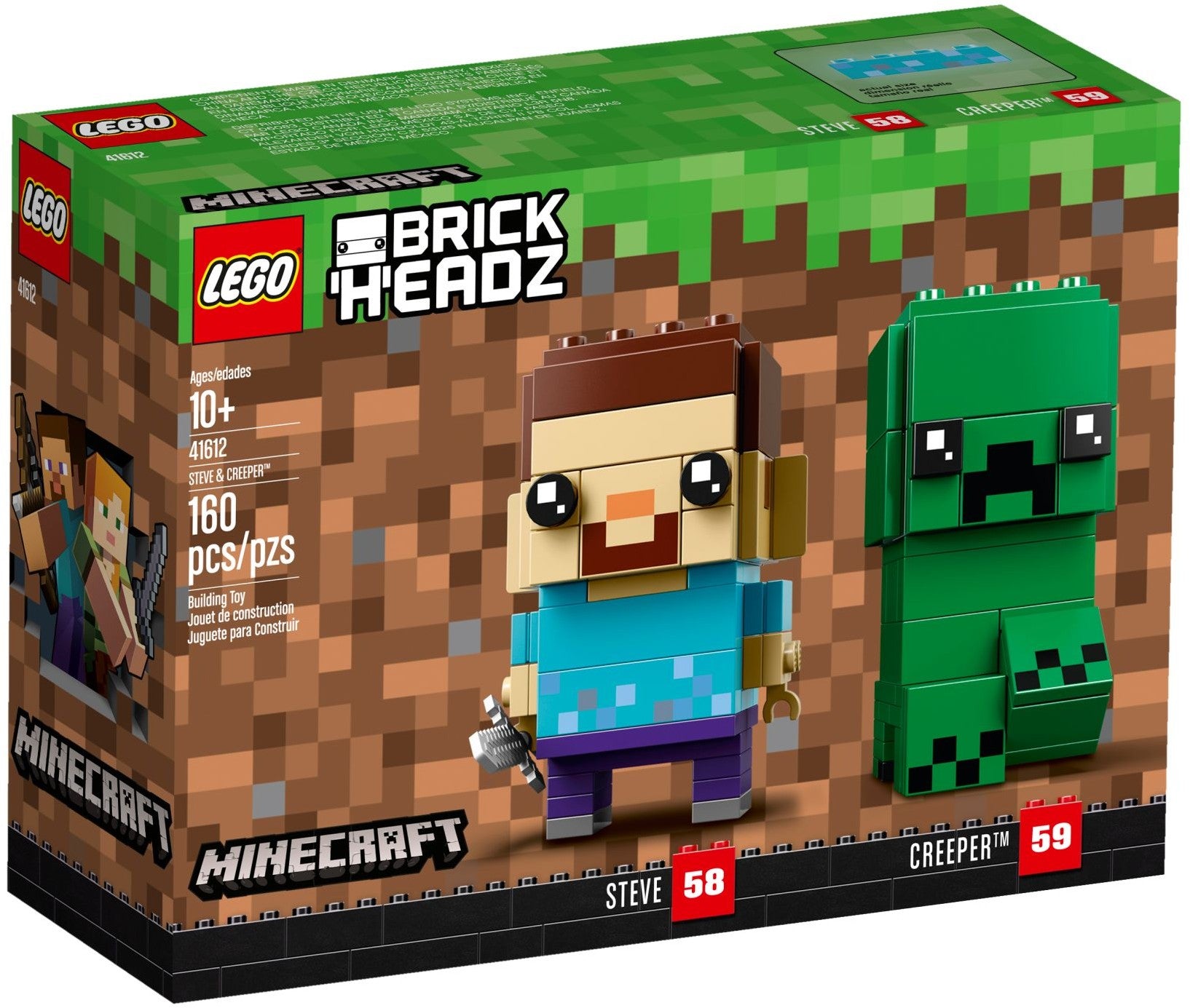 These LEGO® BrickHeadzTM 41612 Steve and CreeperTM construction characters are fun to build using colourful LEGO bricks that recreate their 3D style and iconic details from the hit MinecraftTM game. Steve also has a detachable ‘diamond’ sword to defend himself against the Creeper and a pickaxe for finding ore. They both stand on a buildable collector's baseplate for easy display in your home, office, or any biome you like.