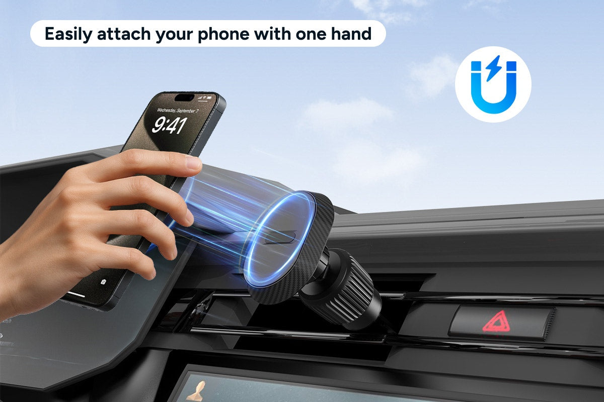 Keep your phone secure and in view with this MagSafe Compatible Air Vent Car Phone Holder. Designed for effortless one-handed use, this sleek magnetic mount offers a firm grip, smooth rotation and perfect positioning for safer, more convenient driving.