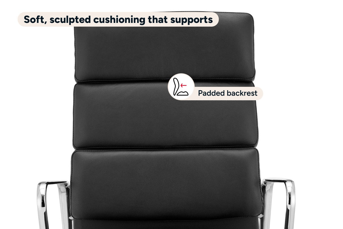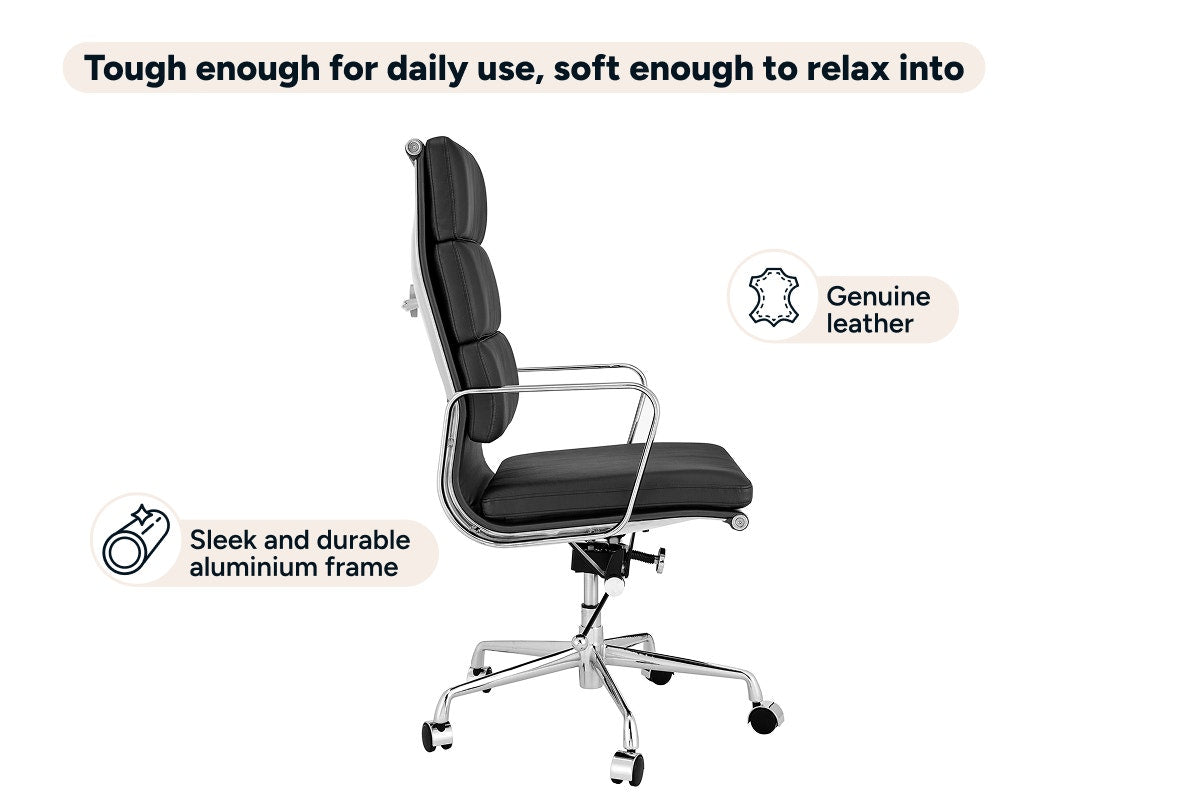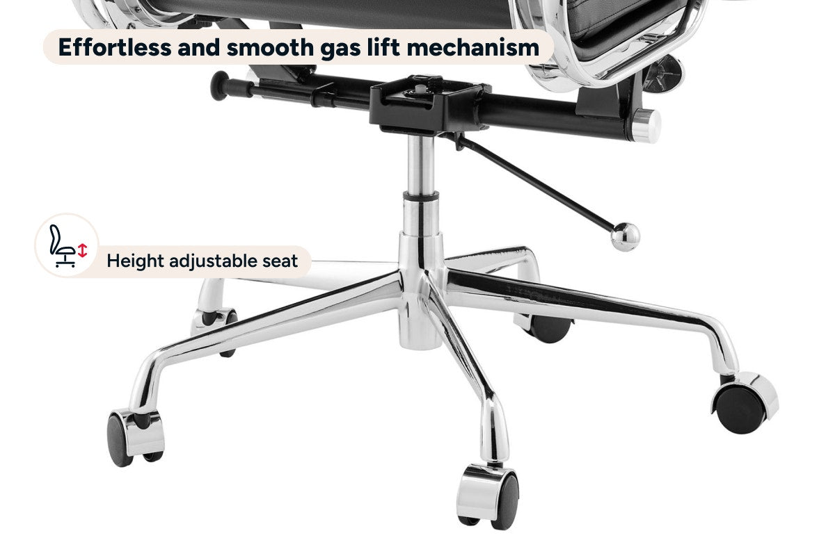 Designed with both style and support in mind, this chair offers a padded back and seat, genuine leather upholstery, and a sturdy aluminum frame. Its adjustable gas lift ensures personalized comfort, making it suitable for long hours at the desk. Perfect for professional offices or home workspaces.