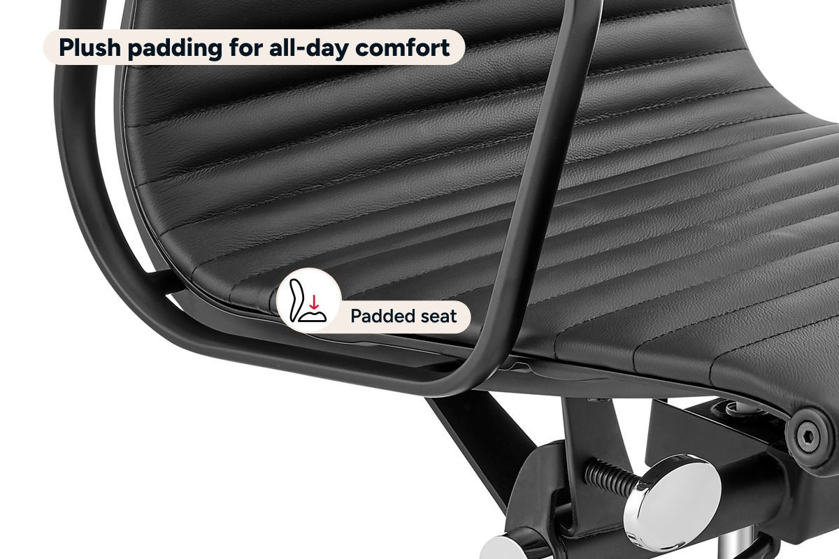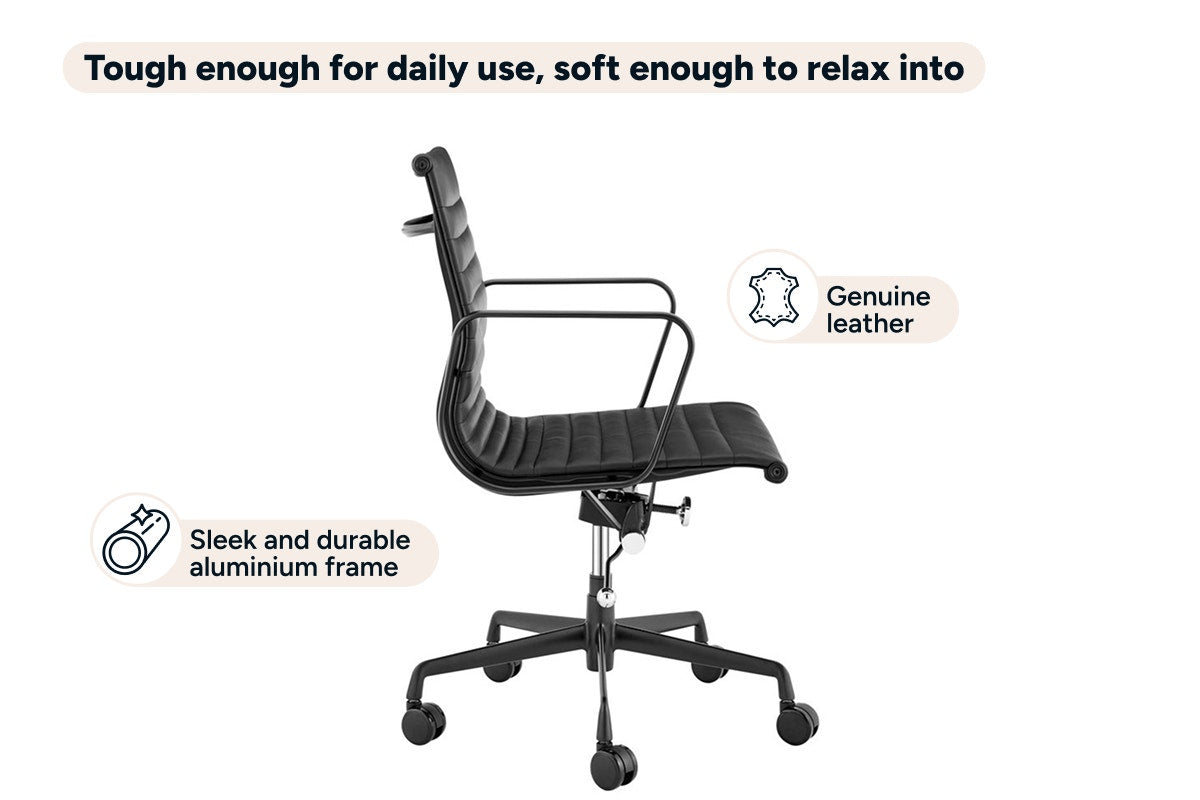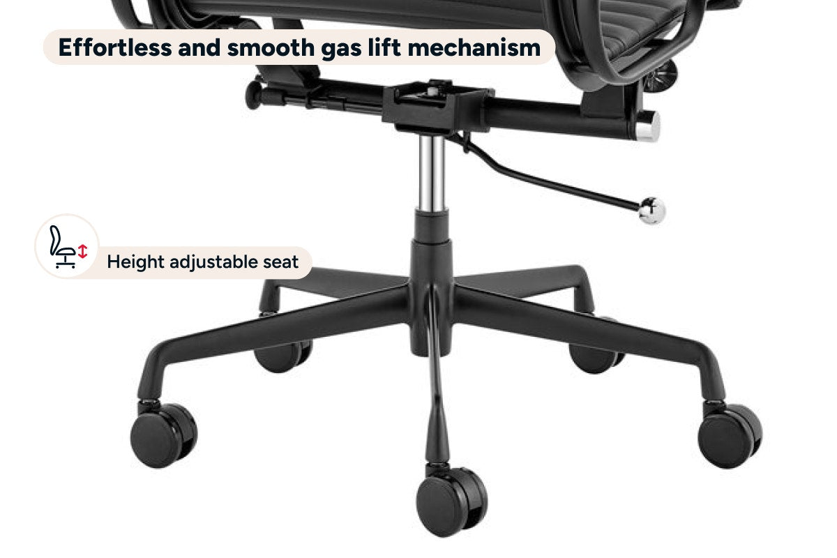 Inspired by the innovative designs of Charles and Ray Eames, this captures the essence of their groundbreaking work. The genuine leather seat and matte black aluminium frame ensure durability and style, while the adjustable gas lift provides personalized ergonomic support.