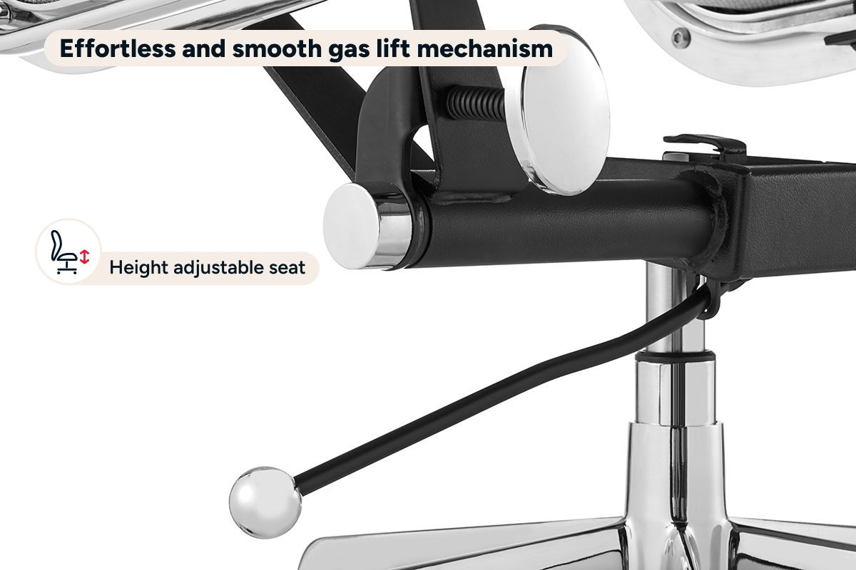 This chair features a sturdy aluminum frame and genuine leather accents, ensuring durability and a luxurious feel. Its ergonomic design provides optimal support and comfort for long hours of use.