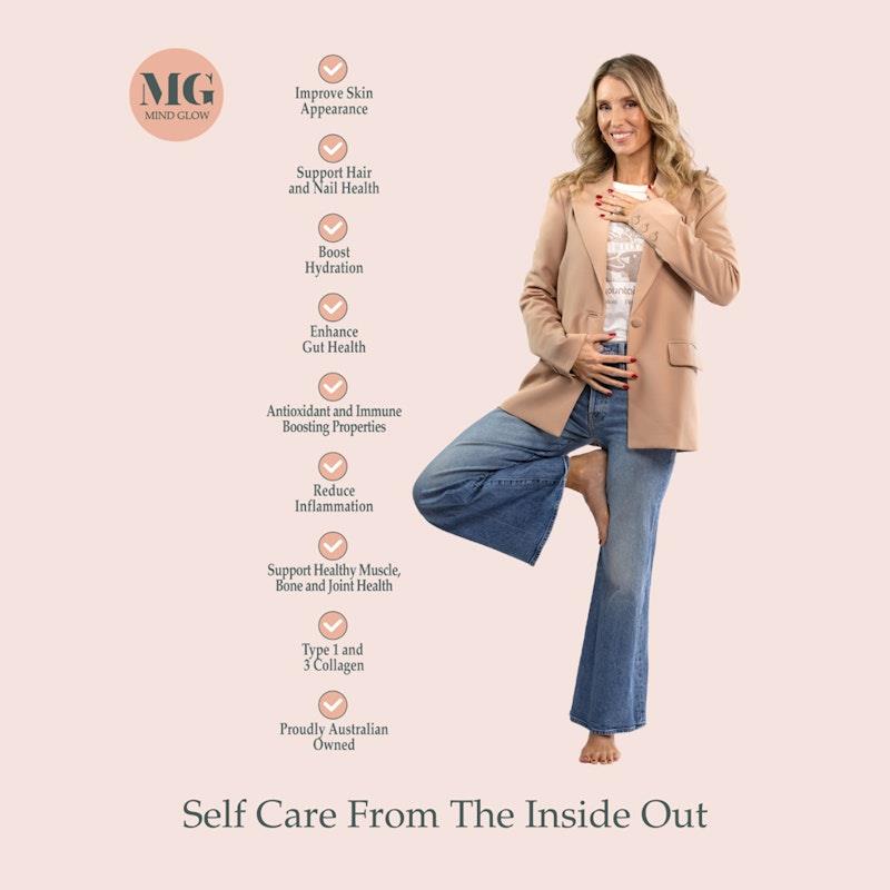 Experience the transformative effects of Mind Glow Collagen Peptides+ and embrace self-care from the inside out!