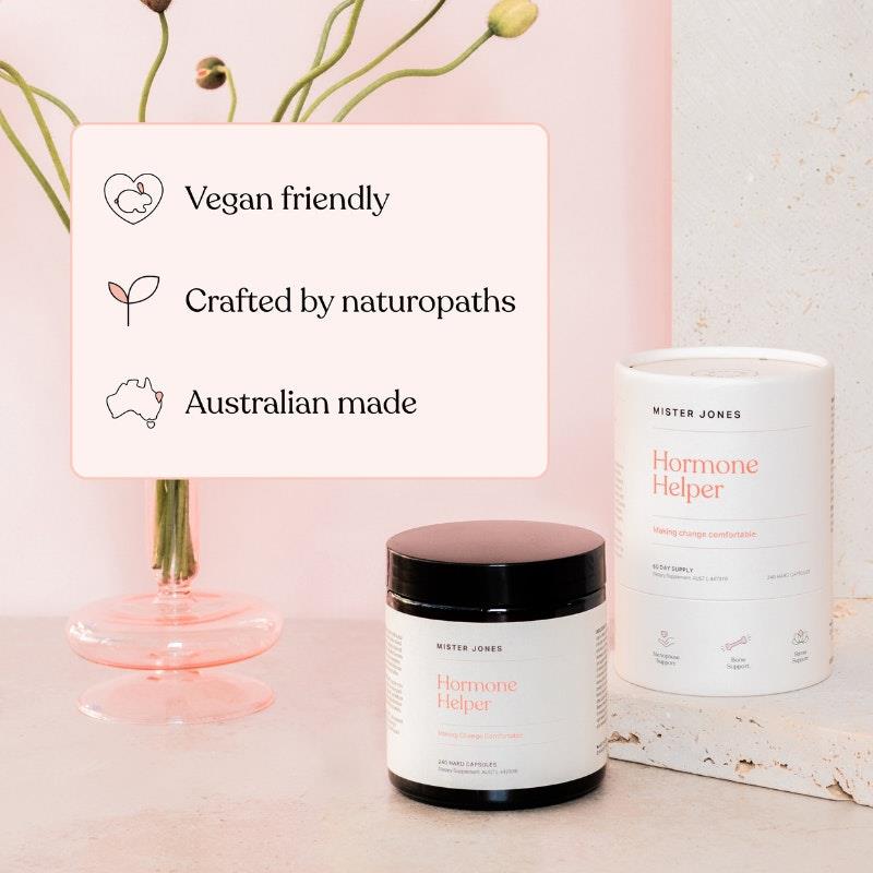 Introducing Mister Jones Hormone Helper, a premier natural menopause supplement designed to help you feel comfortable, capable, and in control during this transformative phase of life. Formulated by naturopaths, this supplement aims to soothe uncomfortable symptoms while boosting mood, energy, and libido enhancement.
