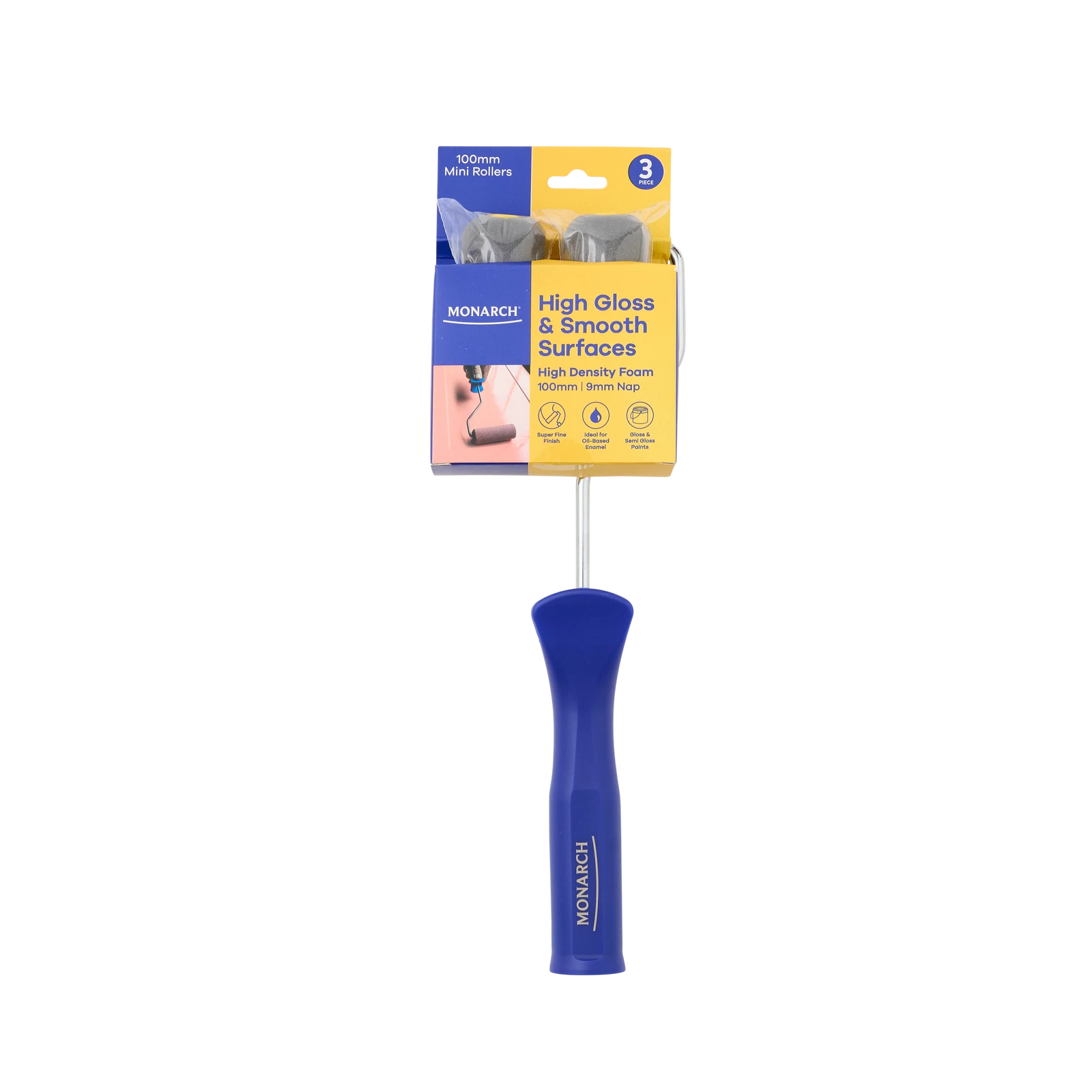 Achieve a flawless, high-gloss finish with the Monarch 100mm 3-Piece Dark High Density Foam Mini Roller. Designed for smooth surfaces and oil-based paints, this premium mini roller set ensures streak-free application and professional results every time.