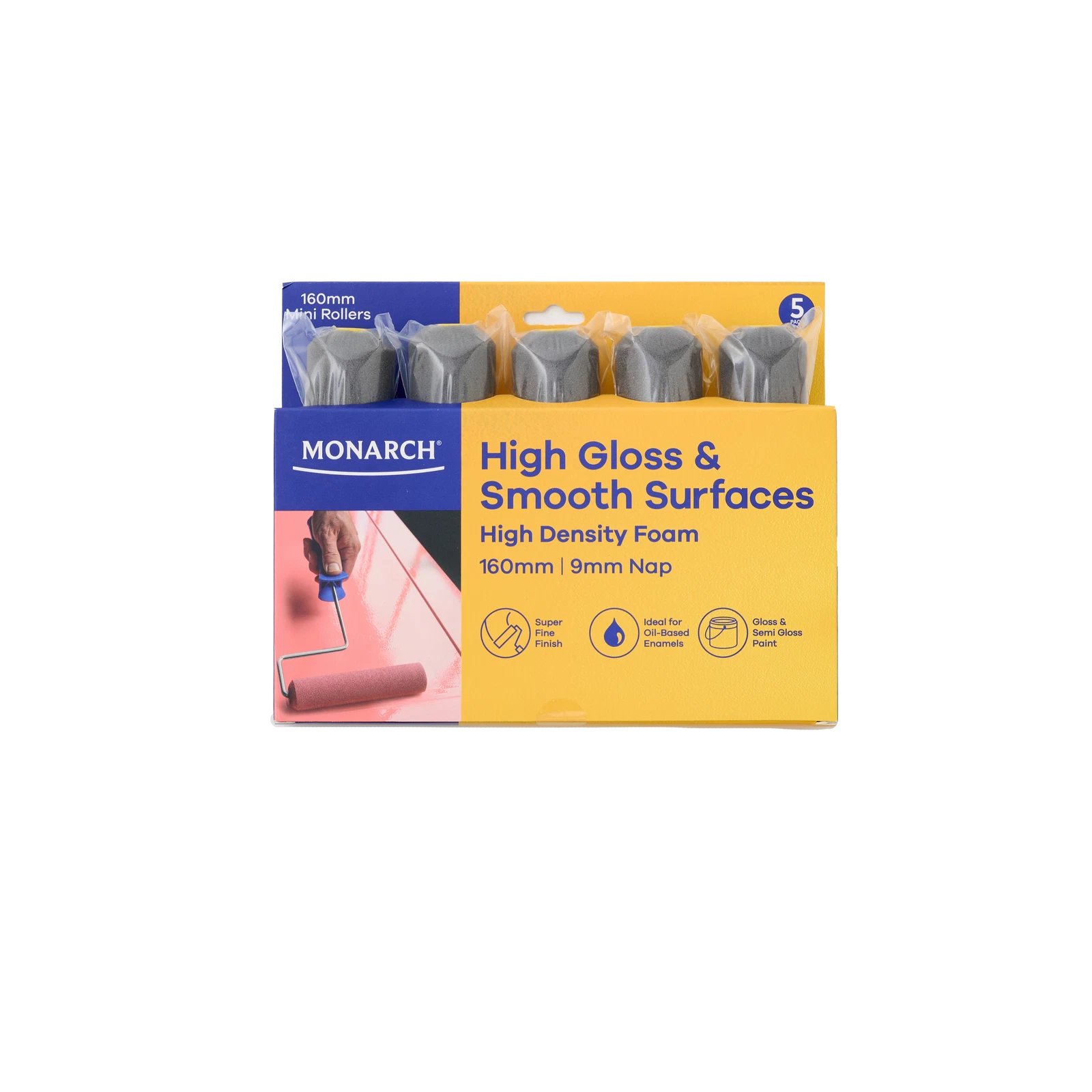 Achieve a flawless, high-gloss finish with the Monarch 160mm Dark High Density Foam Mini Roller. Designed for smooth surfaces and oil-based paints, this pack of five premium mini rollers offers professional-quality results for your painting projects.