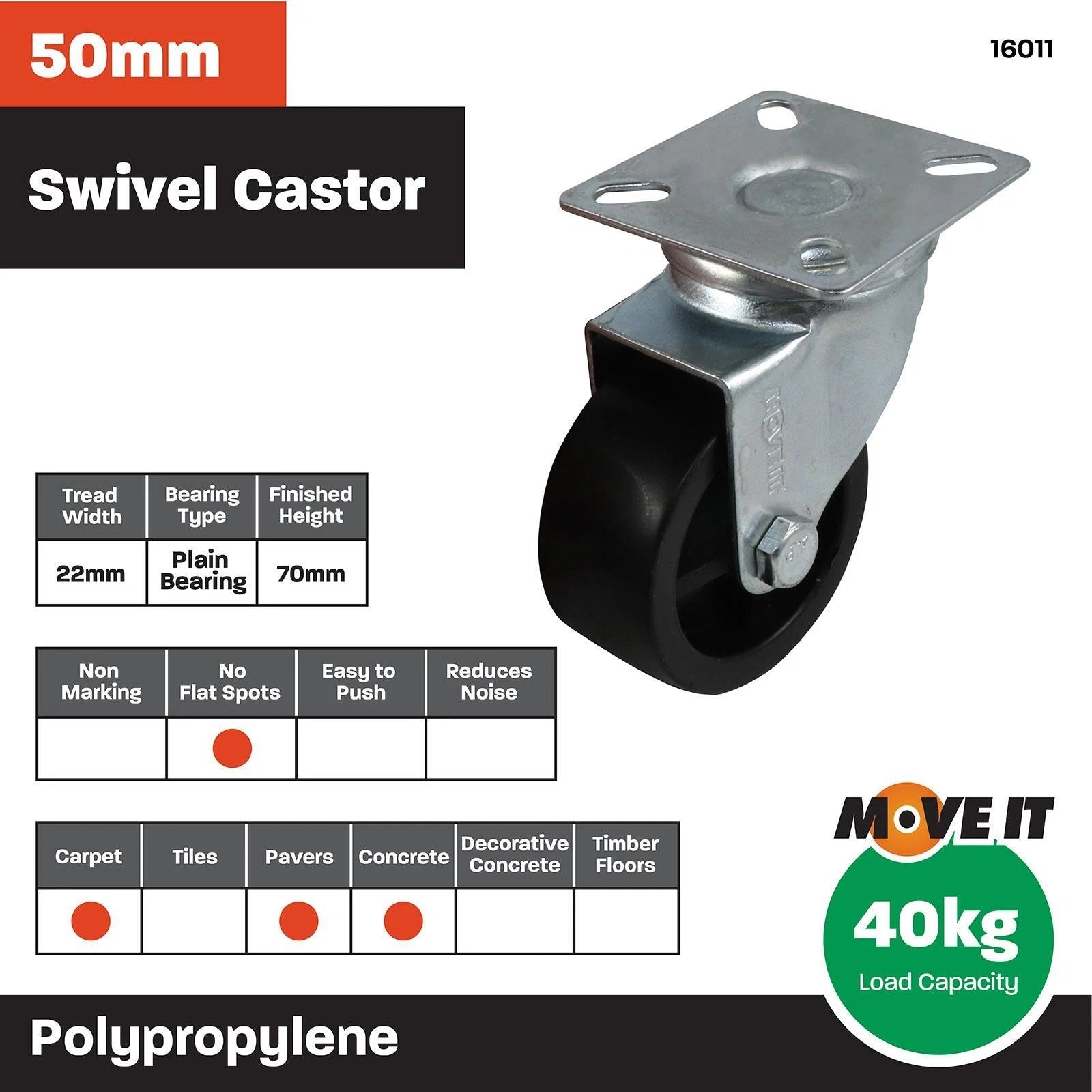 Enhance the mobility of your furniture with the Move It 50 PP Swivel Castor. Designed for durability and ease of use, this high-quality castor is perfect for various applications, especially on carpets. Its robust construction ensures reliable performance and smooth swiveling for effortless movement.