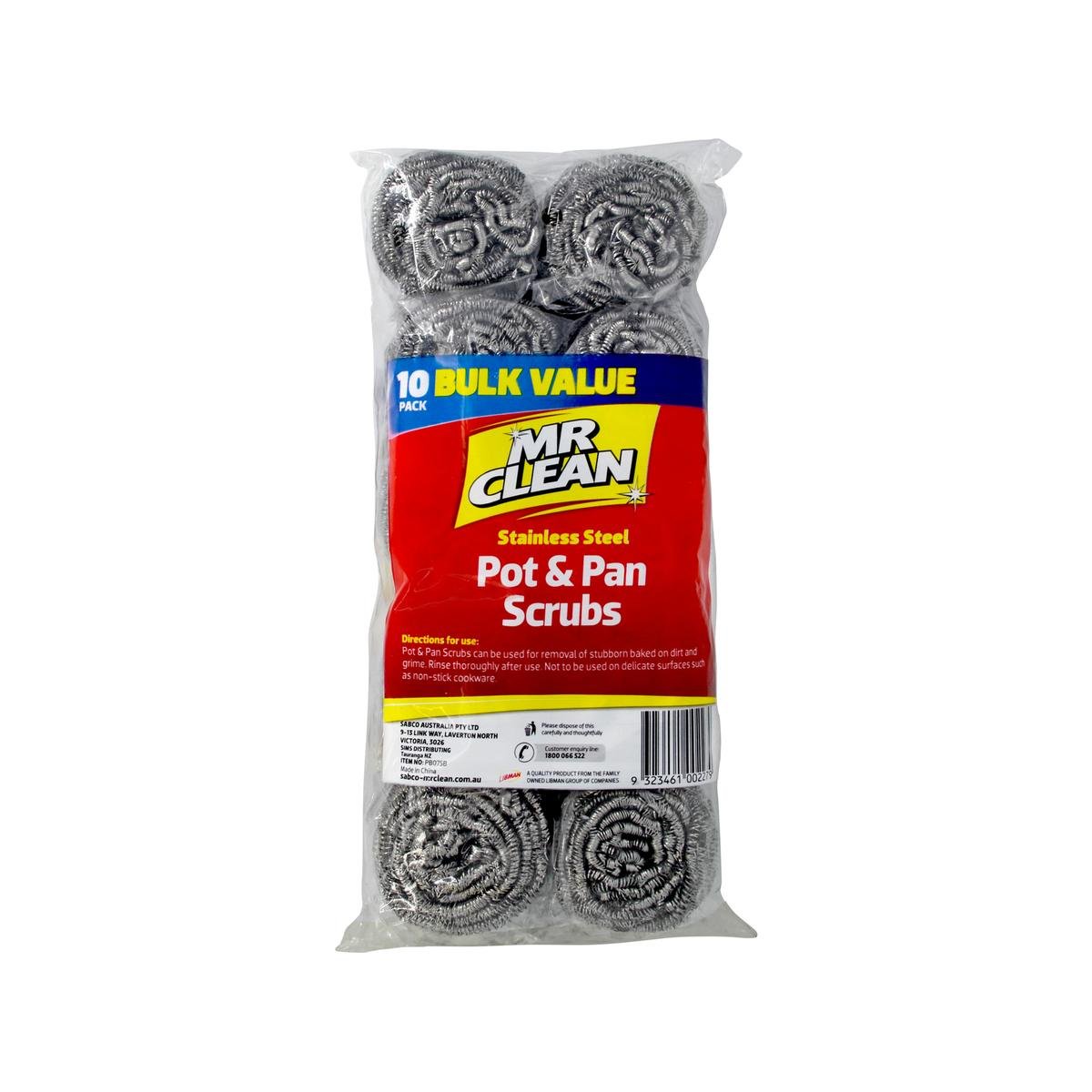 Mr Clean Pot and Pan Scrubs - 10PK - Stainless Steel are designed for effective cleaning, removing tough baked on grime while being long lasting and rust resistant.