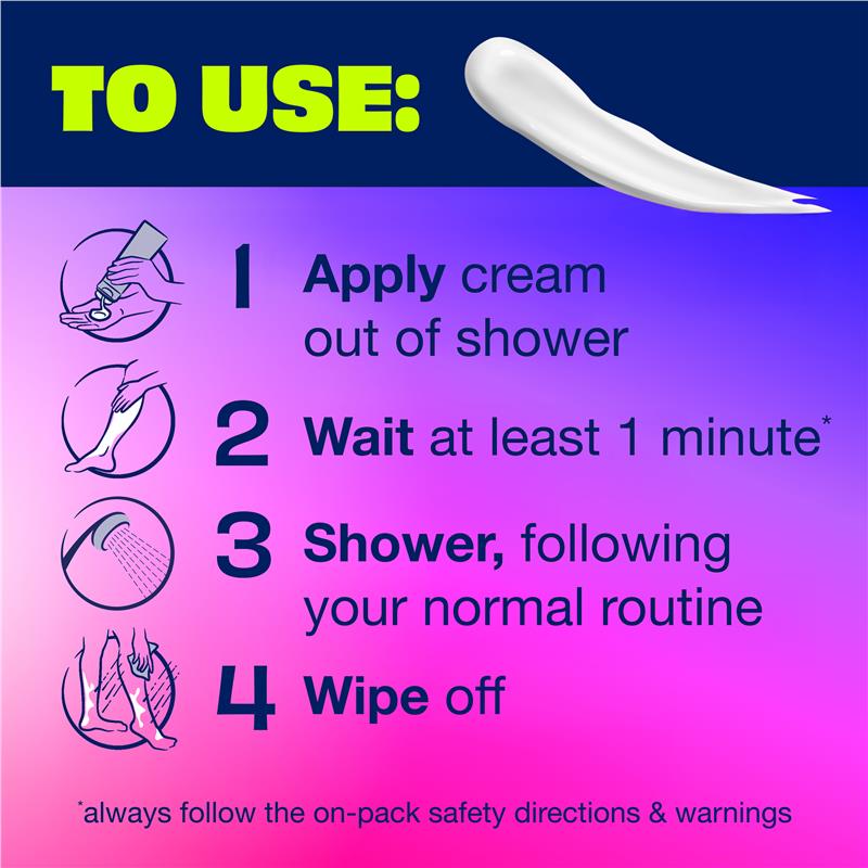 Apply the cream during your shower, allowing it to work its magic while you cleanse. Rinse thoroughly for smooth, hair-free skin.