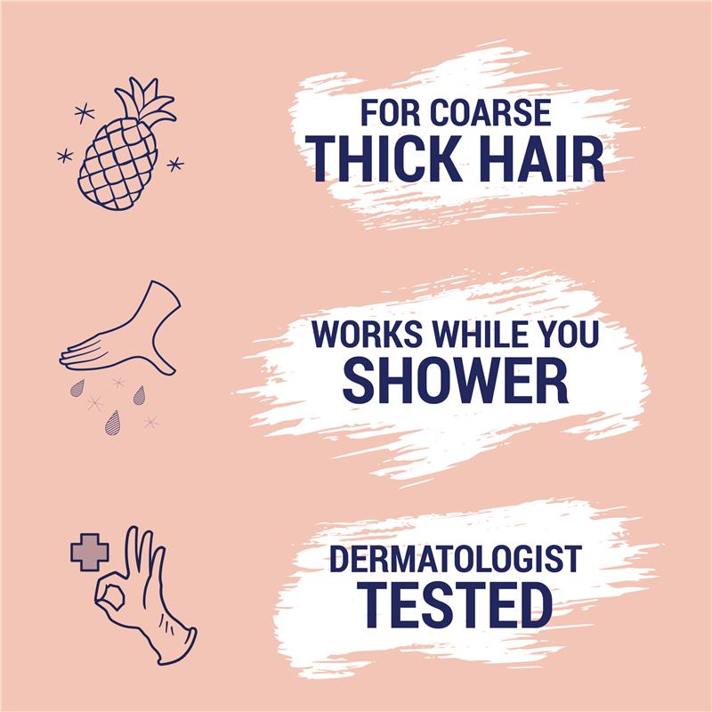 1. PATCH TEST. Before each use, always do a patch test. Apply the product to a small area where hair is to be removed. Follow directions and wait 24 hours. If skin appears normal, proceed with full application. 2. Apply Cream Outside of Shower: Skin must be dry before application. Remove the plug from the pump and turn it counterclockwise to unlock it. Dispense cream with the pump facing away from you and apply an even layer to cover hair. DO NOT RUB IN. Wait at least 1 minute before showering. 3. Shower: Step into the shower and follow your usual routine. For optimum product performance, keep cream away from direct streams of water. Make sure the cream stays on your skin for at least an additional 2 minutes while in the shower. DO NOT EXCEED 10 MINUTES of total application time. 4. Remove/Rinse: Total hair removal depends on hair thickness. Use a washcloth or sponge to remove the cream in a small area first. If the hair comes off easily, remove the rest of the cream by massaging in a circular motion. If the hair does not come off, leave the cream on longer without exceeding 10 minutes of total application time. Once the cream and hair have been removed, RINSE SKIN THOROUGHLY UNDER THE SHOWER. DO NOT RUB. Rinse the washcloth or sponge. Wipe the dispenser clean and close it with the plug when not in use.