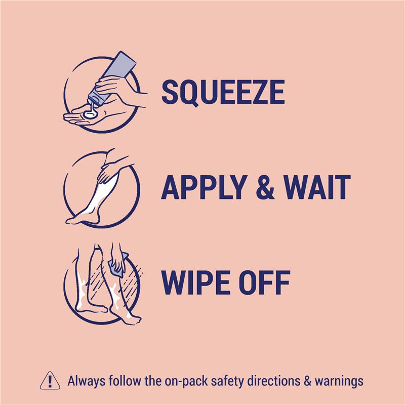 Safety directions and warnings corrosive. Avoid contact with eyes. Avoid contact with skin except as per instructions. Incorrect use could result in severe burns and may harm skin and eyes. Protect eyes during use. Do not mix with hot water before application. Irritation or allergic reaction may occur with some people, even after prior use without adverse effect. Therefore, test before each use by applying the product to a small part of the area where hair is to be removed. Follow directions and wait 24 hours. If skin appears normal, proceed with full application. Do not use on irritated, sunburned, inflamed, or broken skin. If irritation occurs during use, remove the product and rinse the area with cold water. If irritation persists, consult your physician. The product can be used on arms, underarms, legs, and the bikini area. Do not use on the face, around the eyes, in the nose, in the ears, on breast nipples, or in perianal or vaginal/genital areas. Product may cause surfaces to become slippery. Avoid product contact with other personal/bath items. Clean immediately in case of accidental contact with the cream. Contains thioglycolate. Contains alkali. Follow the instructions.
