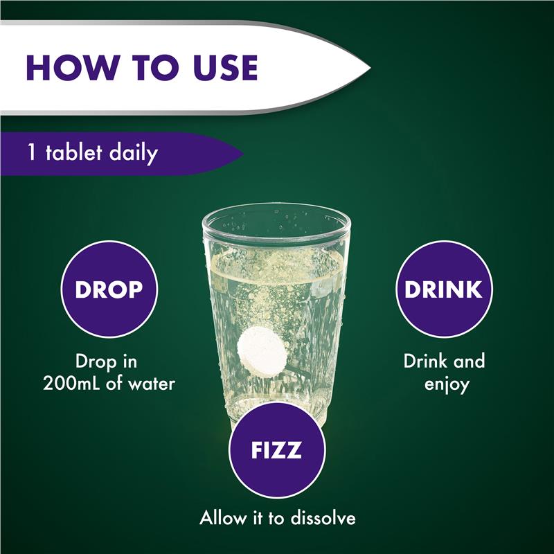 Suitable For: Adults Take 1 tablet daily, dissolved in 200 mL of water, or as recommended by your healthcare professional. If symptoms persist, see your healthcare professional.