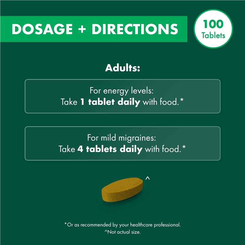 Recommended Adult DosageFor energy levels: Take 1 tablet daily with food.For mild migraines: Take 4 tablets daily with food. Or as recommended by your healthcare professional.