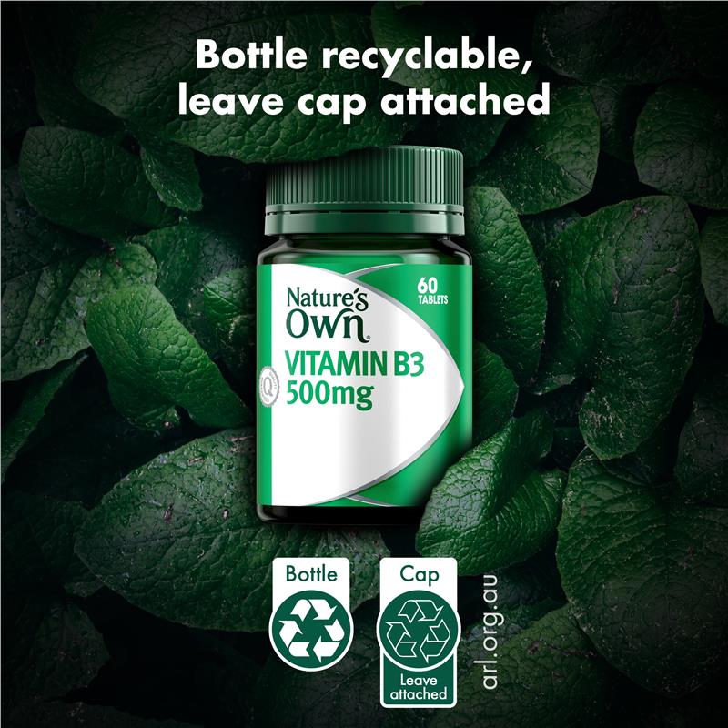 Support skin health and maintain energy levels with Nature's Own Vitamin B3 500mg tablets. Our easy-to-swallow supplement provides 500 milligrams of nicotinamide (vitamin B3) to help support your body in metabolizing carbohydrates, proteins, and dietary fats. In addition, Nature's Own Vitamin B3 500 mg tablets also relieve tiredness in healthy individuals and support body mucous membrane health. Nature's Own Vitamin B3 500mg tablets also maintain vitamin B3 within the normal range. Australian Made® and rigorously tested to ensure quality, potency, and purity, Nature's Own Vitamin B3 500mg tablets contain no added gluten, lactose, sugar, artificial colors, artificial flavors, artificial sweeteners, artificial preservatives, dairy products, or animal-derived products. Adults, take 1 tablet daily with food or as recommended by your healthcare professional. Always read and follow the directions for use.