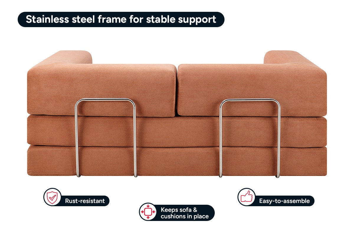 Unlike sofas that slide and sag, the Ovela Mia feels solid and dependable thanks to its integrated stainless steel frame. Inside the seat cushions, pocket springs are layered with foam for added bounce and lasting comfort, while the sleek, rust-resistant bars lock everything into place so every seat feels balanced and built to last.