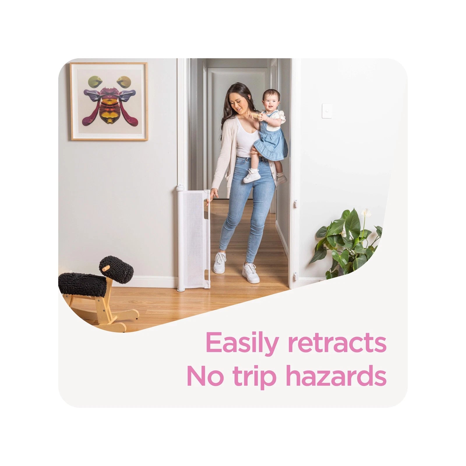 Constructed with UV and stain-resistant woven mesh, this gate resists pet claws and outdoor elements, ensuring long-lasting performance. Its sturdy design and high-quality materials make it a dependable choice for busy households.