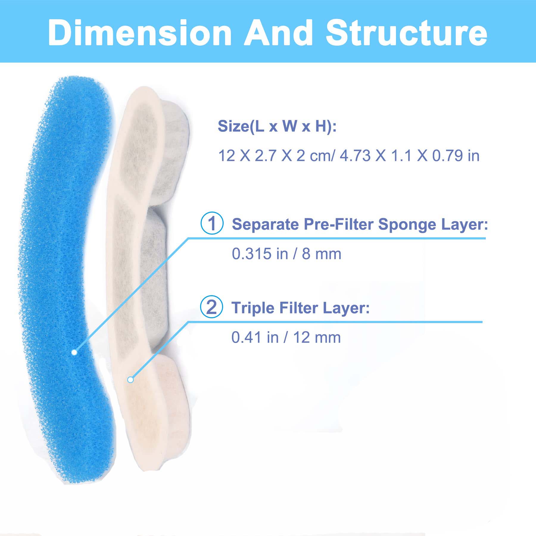 Pet water fountain filters are composed of a separate pre-filter sponge and a triple filtration food grade cat fountain filter. Besides the pre-filter sponge to pretect the pump and filter impurities, PP cotton catch cats hair and debris, the ion exchange resin layer soften the tap water, the carbon layer remove bad taste. The cat fountain filter can effectively maintain water quality by the multiple filtrations to provide healthy and hygienic water to pets.