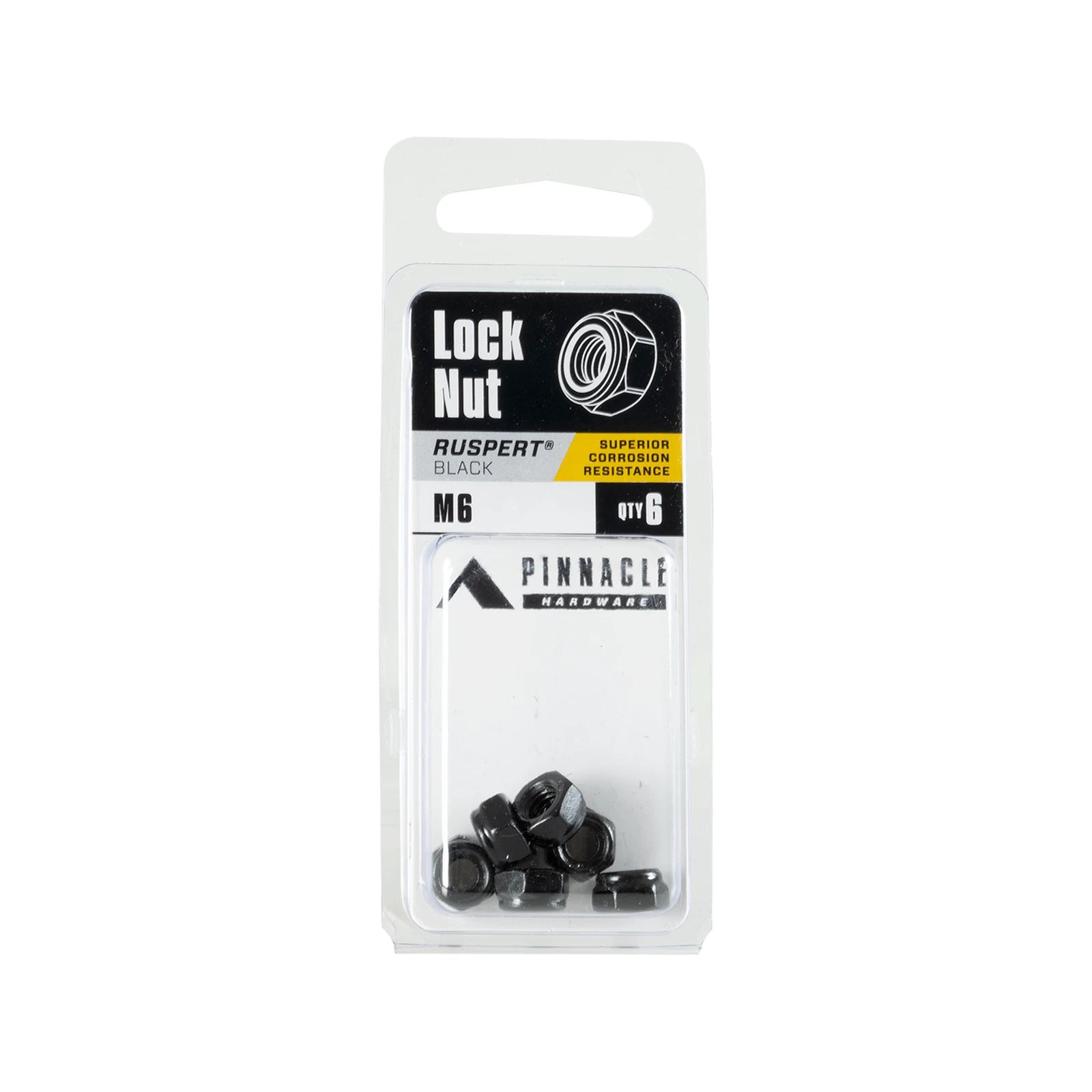 Ensure secure fastening with the Pinnacle M6 Black Ruspert Nylon Lock Nut. Designed for durability and reliability, this pack of six lock nuts is perfect for a variety of indoor and outdoor applications. Featuring a corrosion-resistant finish and a nylon insert to prevent loosening, these nuts provide a dependable solution for your fastening needs.
