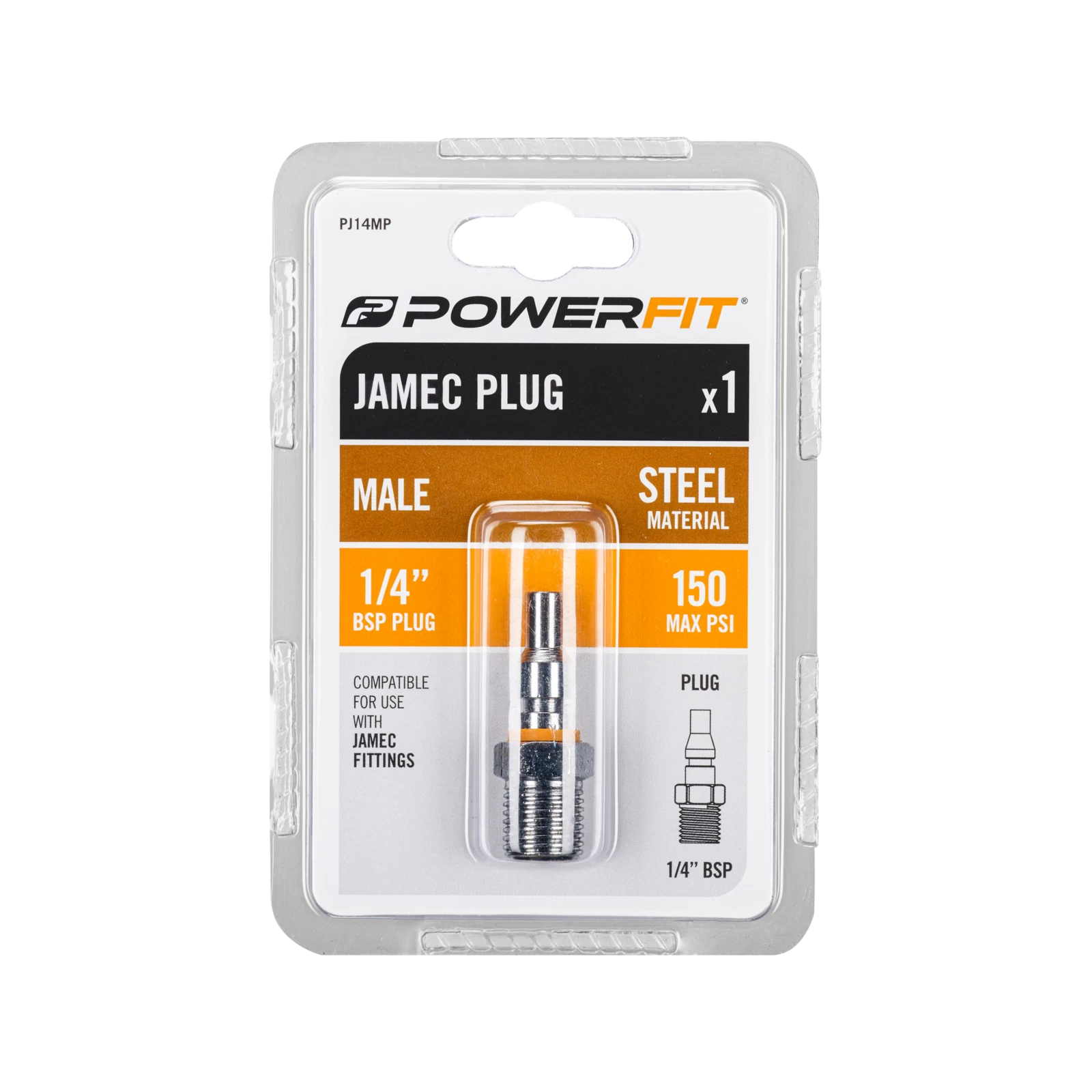 Upgrade your air tool connections with the Powerfit Jamec Style 1/4" Male Plug. Designed for durability and ease of use, this fitting is ideal for a variety of air compressor and tool setups. Its robust steel construction ensures long-lasting performance, while the distinctive orange band makes identification quick and simple.