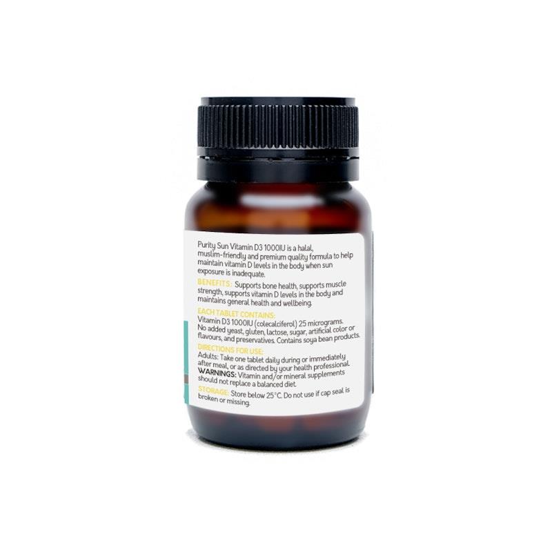 The Purity Sun Vitamin D3 1000 IU is a premium formula designed to support your vitamin D levels, especially when sun exposure is limited. Each bottle contains: