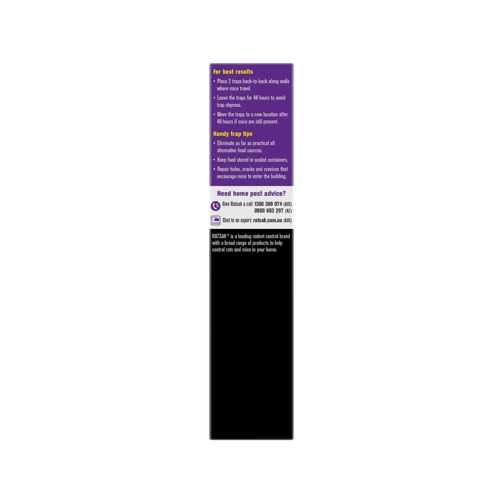 The RATSAK Clean Kill Mouse Trap offers a safe, humane, and hygienic solution for mouse control. Its enclosed design, precision technology, and easy disposal make it an ideal choice for homes and spaces where safety is a priority.